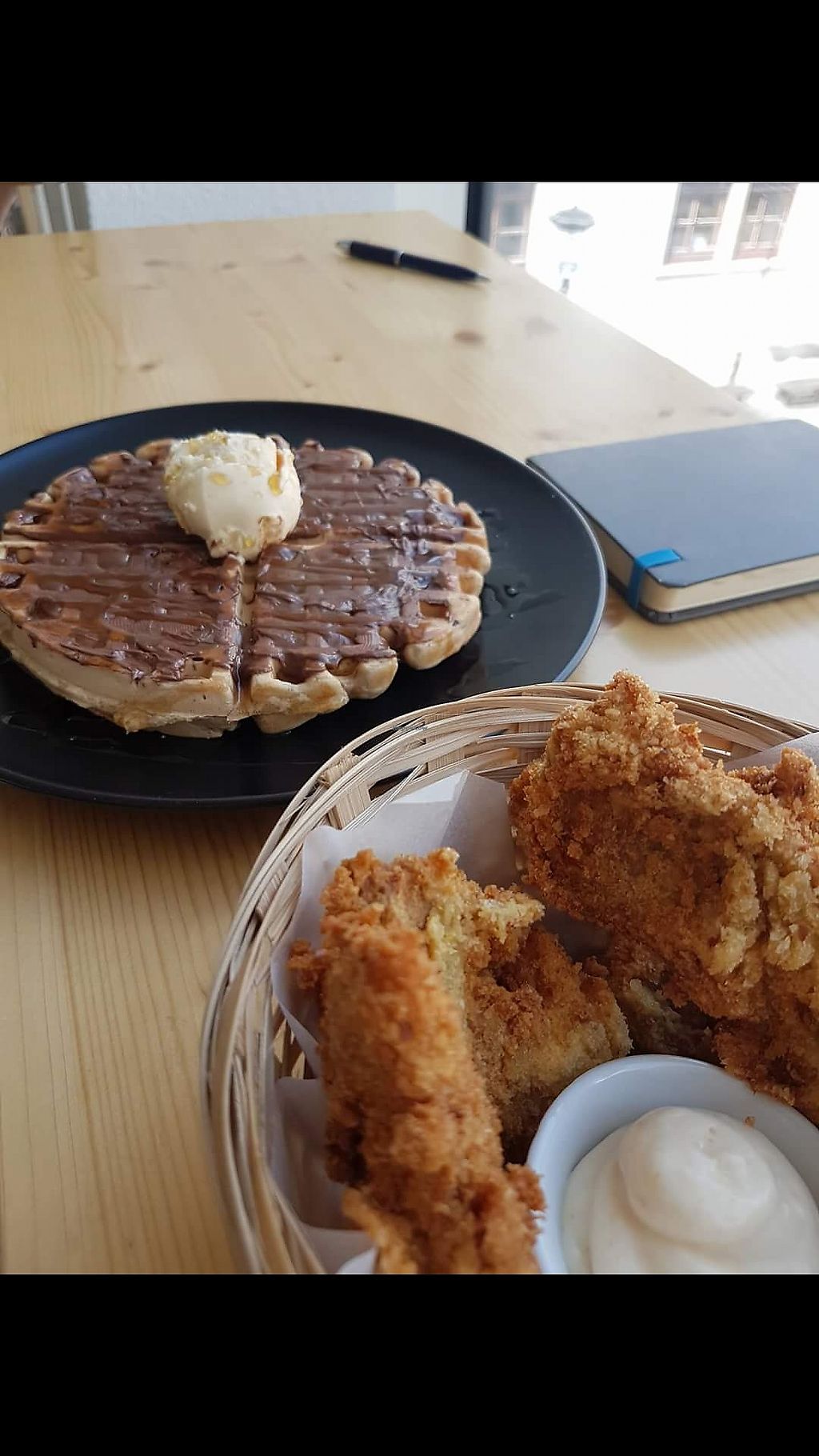 Waffle with vegan cream, strawberries and banana