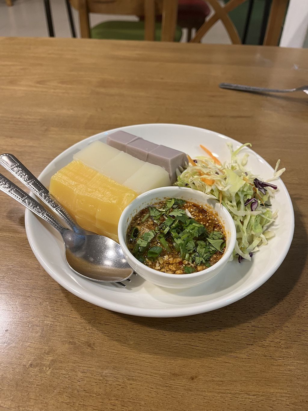We were really happy to have found this place. It has a mix of Shan (a type of Burmese) and Thai food. It is veggie but there are signs asking you to specify no egg if vegan, which is easy enough. The food came out really fast, was very good price and super tasty. We found the tofu gravy soup a bit weird but glad to have tried! Really enjoyed the spicy fried chickpea tofu salad though. The menu is very extensive and a little confusing but it’s fun to navigate! Free water and toppings for your food. Would recommend.