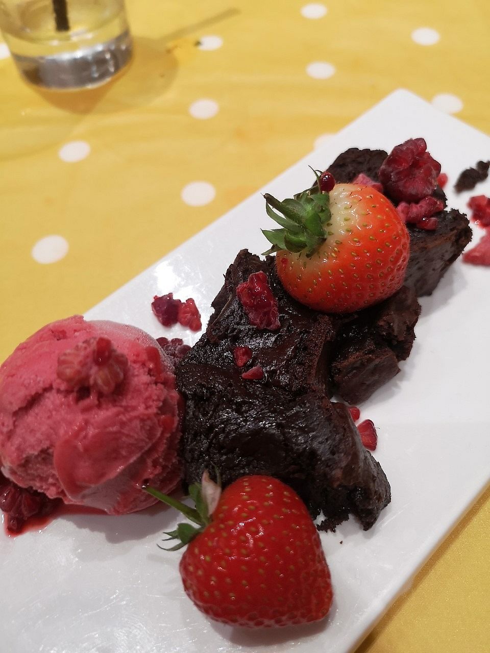 Vegan brownie with raspberry sorbet!