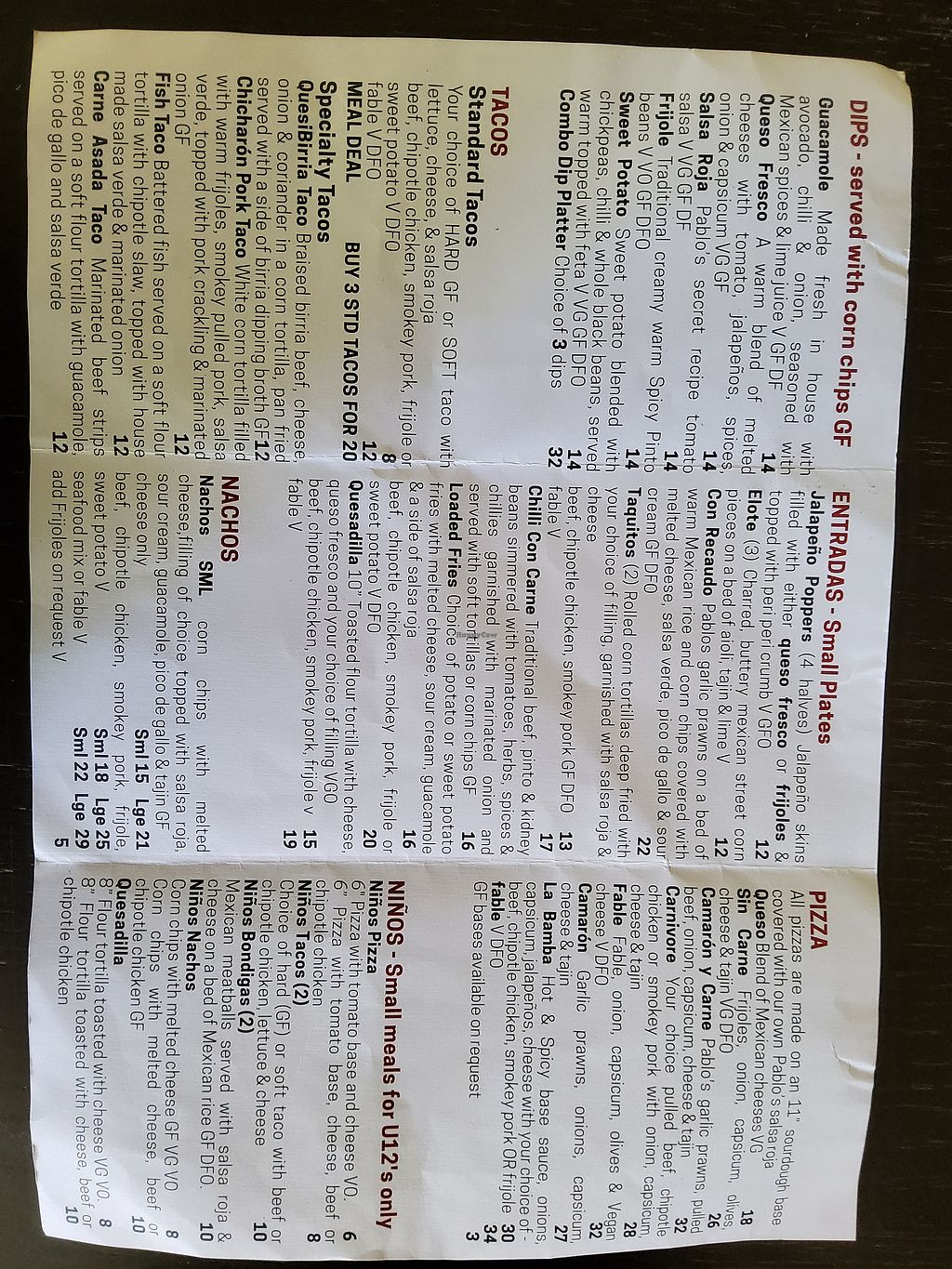 Serves meat, vegan options available. Mexican restaurant vegan cheese alternative and mock meat. Food menu is clearly labeled. Example offerings include nachos, enchiladas, burritos and more. Open Mon-Sun 5:00pm-8:00pm.