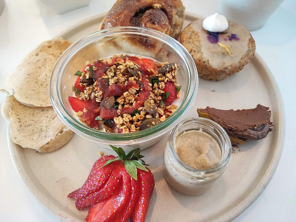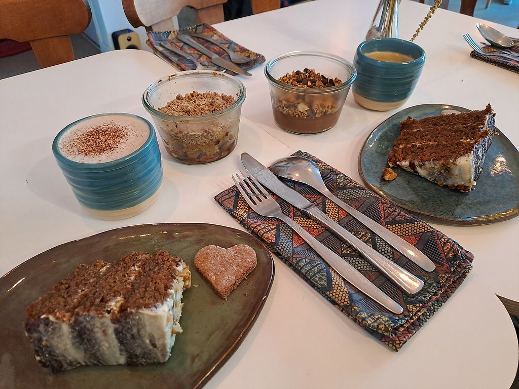 Carrot cake, apple crumble and chocolate cream