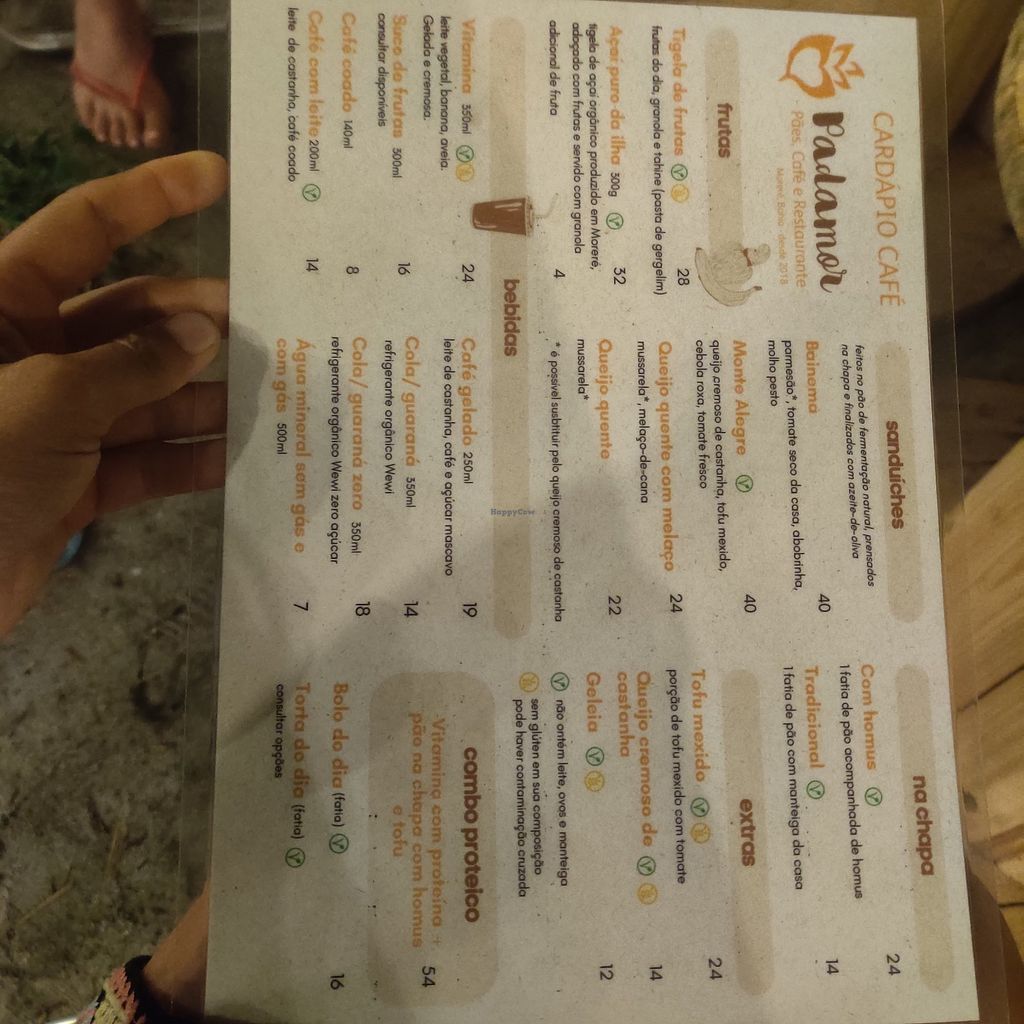 An artisan bakery and vegetarian restaurant located in the village of Moreré. The menu highlights plant-based ingredients like house-made creamy cashew cheese and scrambled tofu. Vegan options are clearly marked (V) and include the "Monte Alegre" sandwich (tofu, cashew cheese, red onion) and a plant-based burger topped with caramelized onions and banana chips. Main dishes feature falafel spaghetti and fresh poke bowls with shiitake mushrooms. For dessert, there are acai bowls, fruit with granola, and a "Tart of the Day" made with a cashew mousse base. Open Mon-Tue 8:00am-12:00pm, 4:30pm-9:30pm, Wed 8:00am-9:30pm, Thu-Sun 8:00am-12:00pm, 4:30pm-9:30pm.