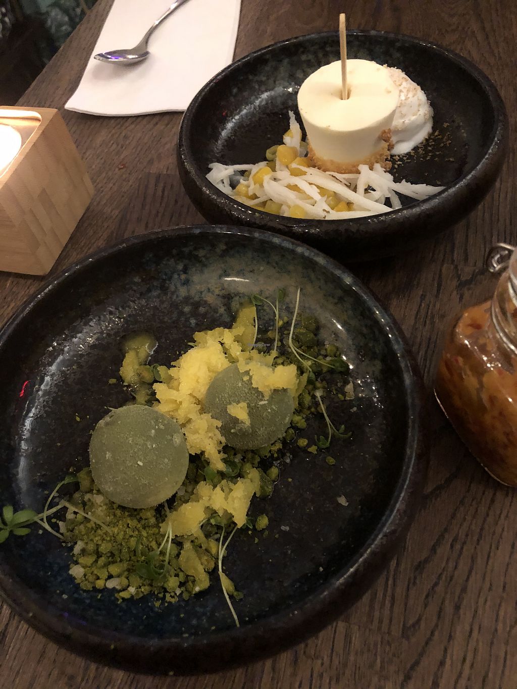 Risotto-style spinach and corn in coconut cream, puffed corn and pumpk…