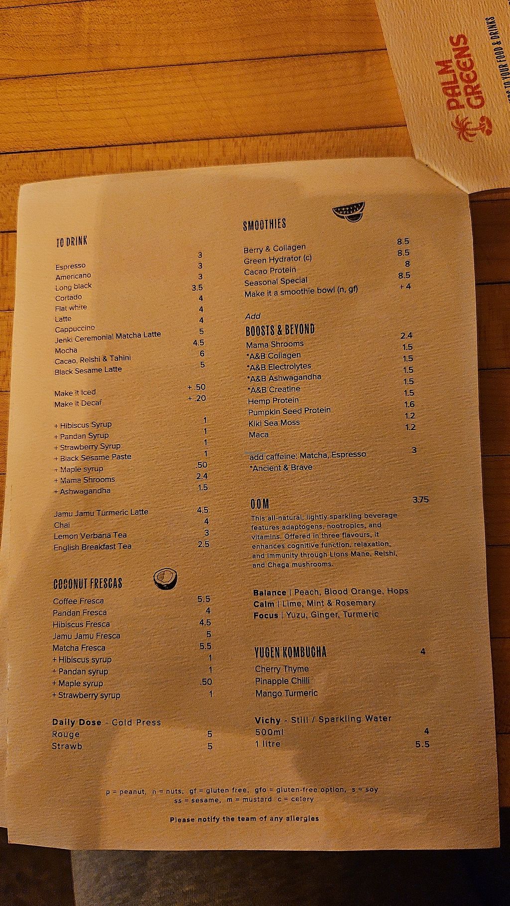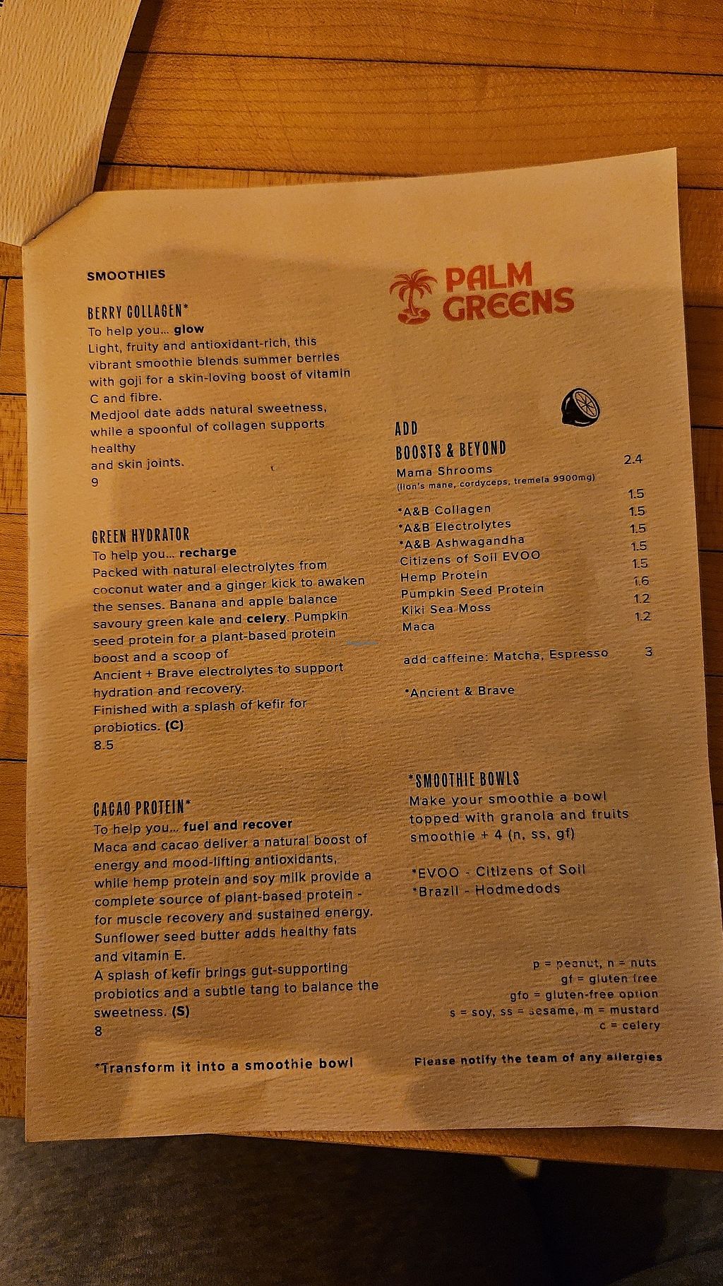 We understand the menu is smaller but the dishes we do have are Palm Greens favourites, with changing seasonal specials. They are substantial, nutritionally balanced, and much loved by those who eat with us.