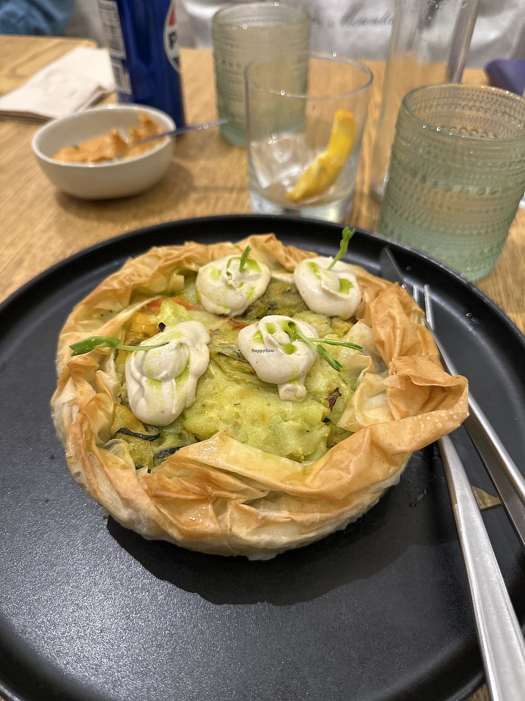 Spaghetti carbonara and tofu tortilla