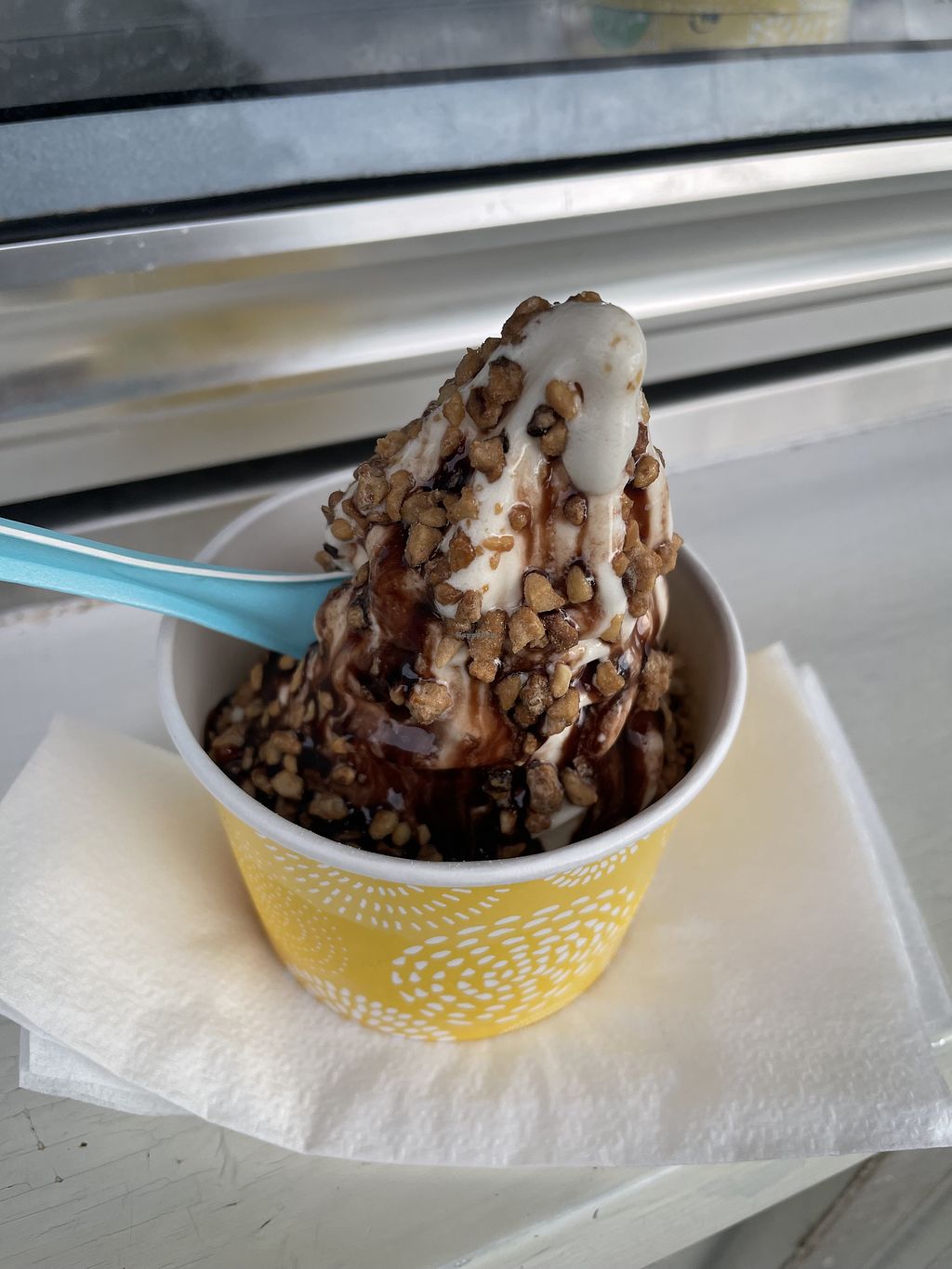 Soft ice cream, their specialty flavor with vanilla and raspberry, strβ¦