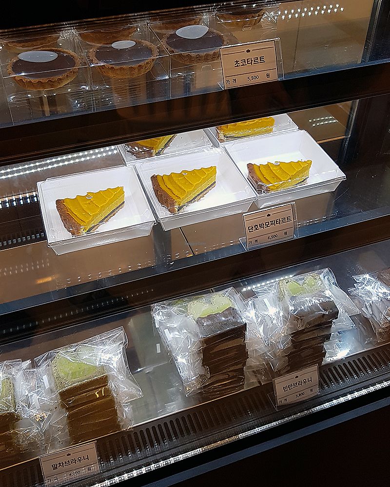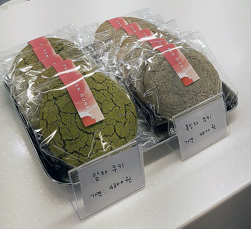 Green: Green tea cookie (말차쿠키). Orange: sweet pumpkin mochi tarte (단호박…