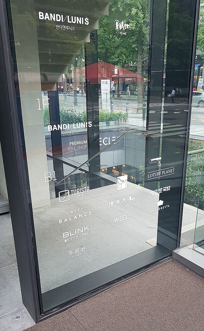 Entrance to basement level, where coffee shops and restaurants are loc…