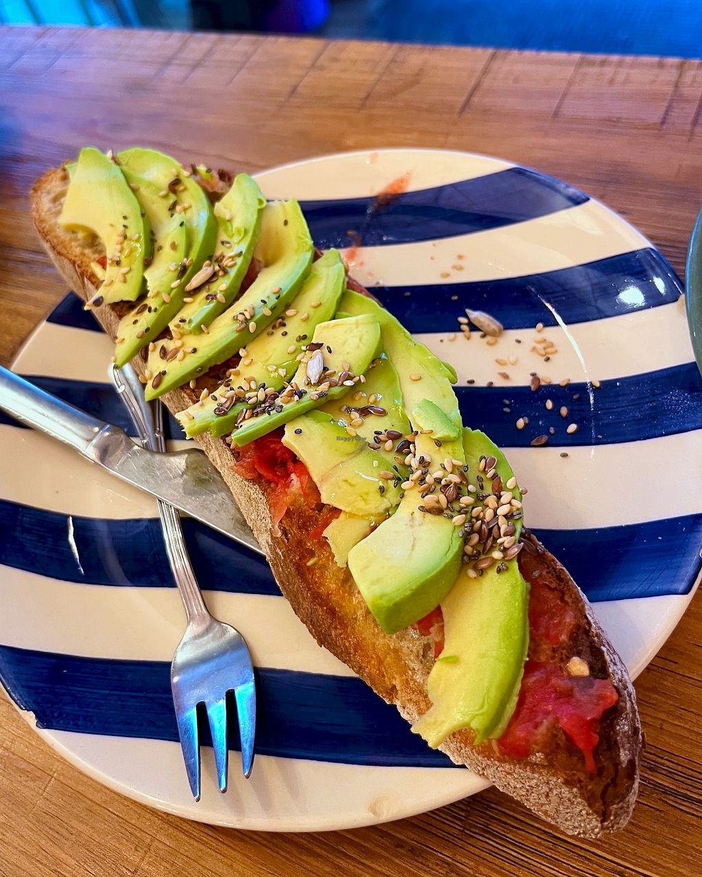 A very tasty toast with tomatoes, avocado and seeds, and delicious coffee with vegetable milk. Toast on a huge piece of hot bread. Not a bad option for breakfast, my husband and I had breakfast here a few times.