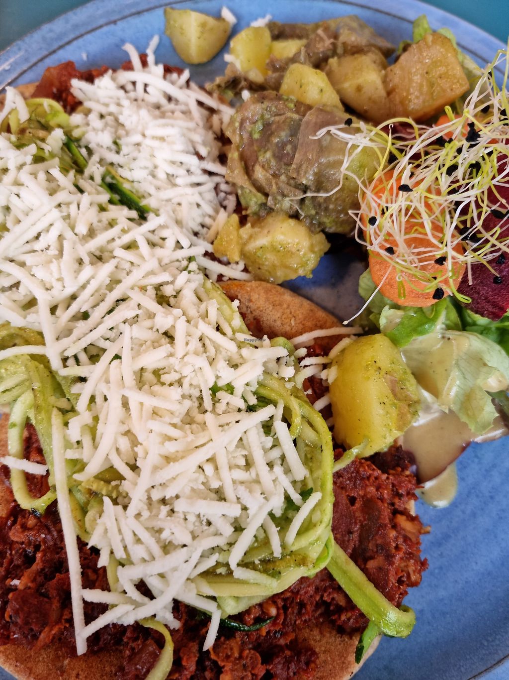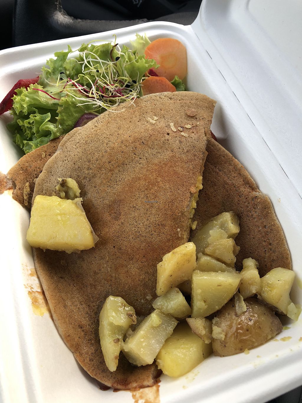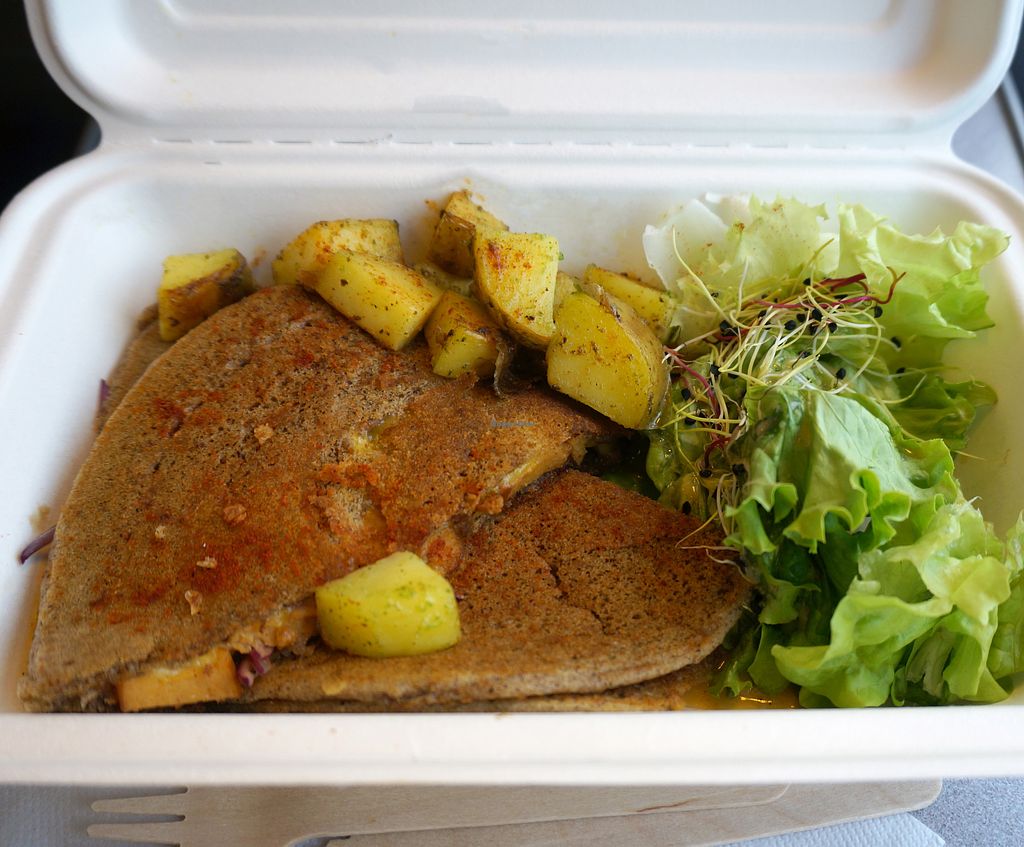 "Yes vegan" pancake: Tasty, the pie is good. Served with salad and potatoes.
