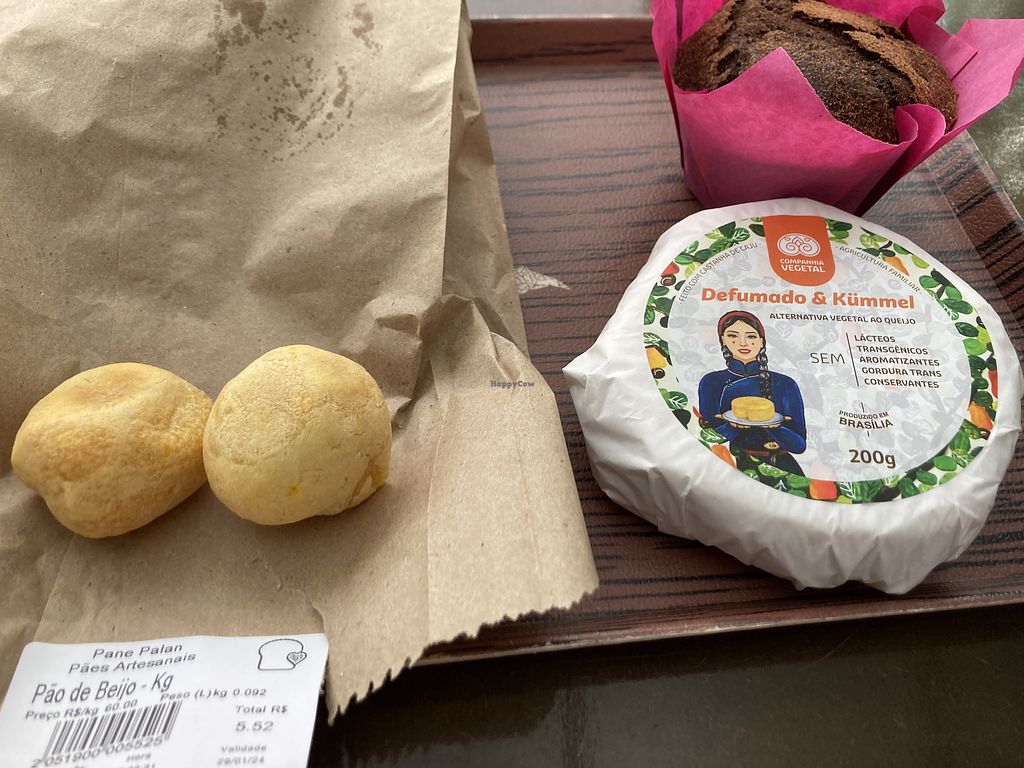 This place is great, I went several times during my stay. Bakery is always busy it seems. They have vegan pão de beijo, vegan muffins, and sometimes vegan spinach hand pies, and you can also order vegan pizza. They also sell vegan butter and cheese. The beer out back is also great and the outdoor seating has a great vibe. We got 5 pão de beijo for R$ 5.25 so that is a great snack to go with your coffee, kombucha or beer!