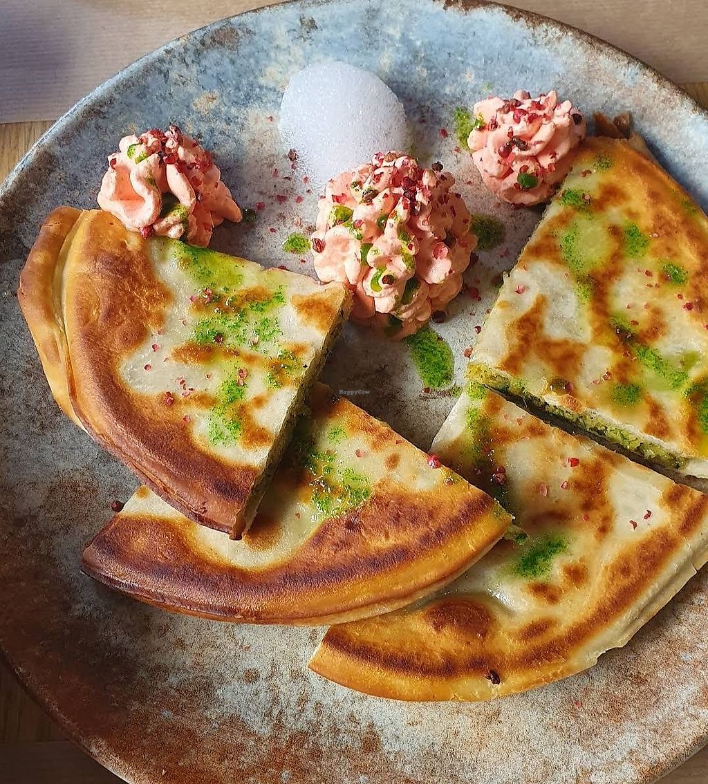 We went here last night, I would recommend sitting upstairs if you want a romantic meal! Had a couple of vegan starters, we had vegan salty Loukoumades, and Pita falafel to start. Pita falafel was delicious and went really well with the tomato mousse. Neither of us were a fan of the Loukoumades, the beansprouts, mousse & syrup were all fridge cold, compared with the warm Loukoumades. The vegan ravioli was beautifully presented but I personally found it quite bland. Wait staff were attentive and knowledgable. It was a nice experience but I wouldn’t rush back