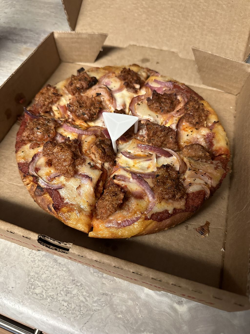 Pros: Vegan cheese and sausage!, Big, filling slices, Delivery to Maxline for free!