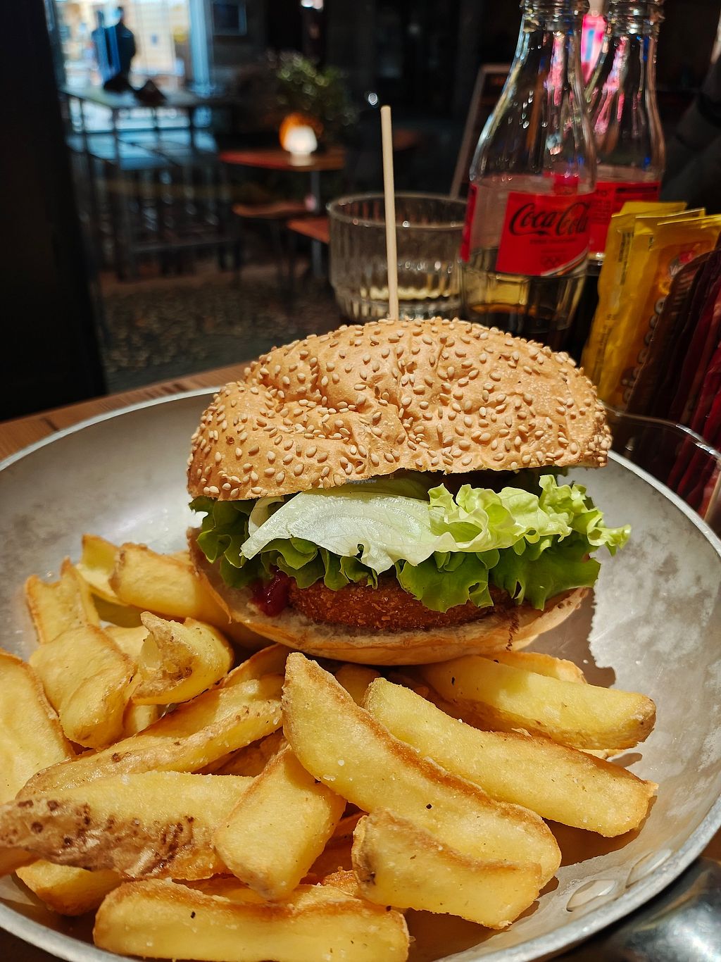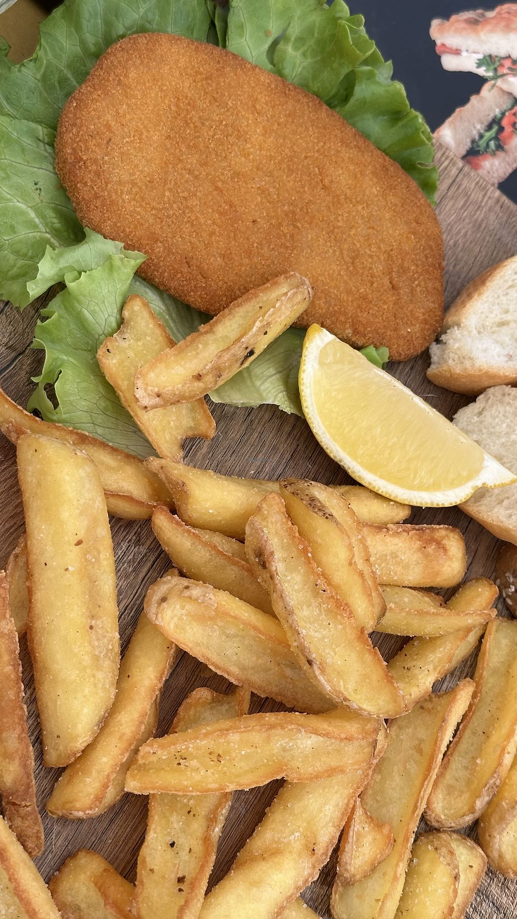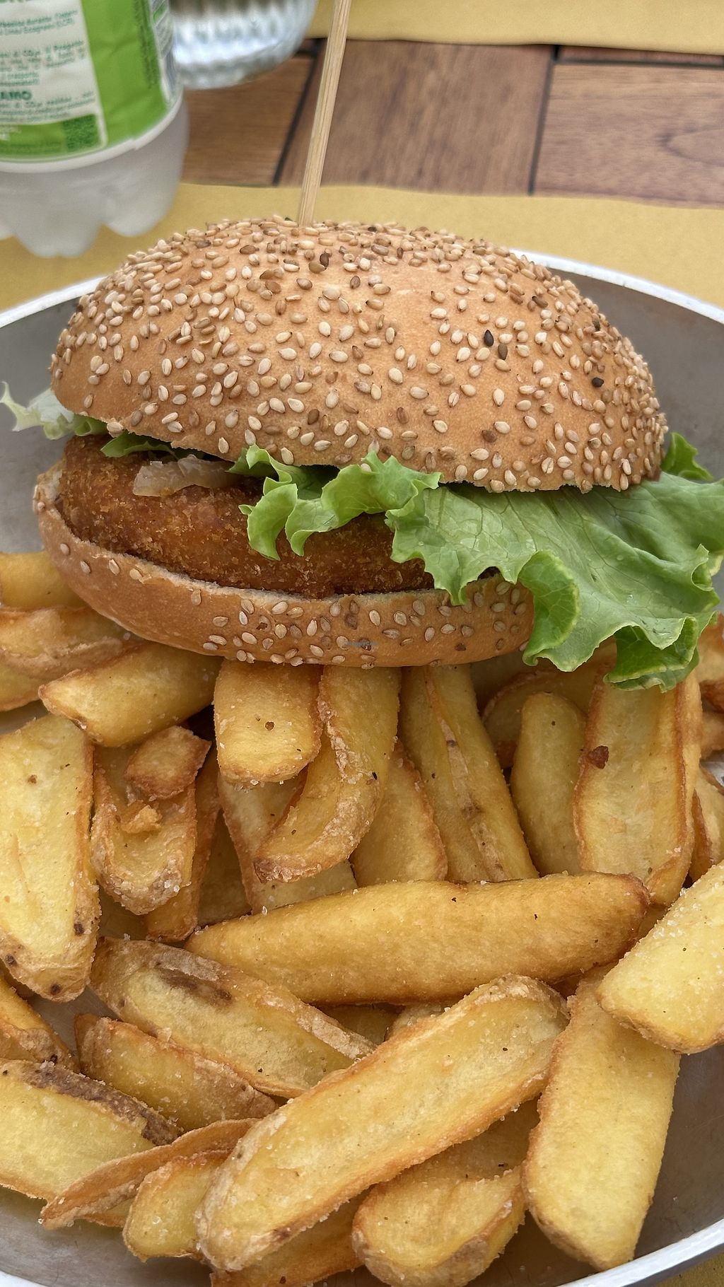 Eles têm dois tipos de hambúrguer raiz, sem ser gourmet, um é de frango empanado e pode pedir com batatinha (maravilhosa). Amamos a apresentação e estava delicioso. Tem schnitzel vegano também. Vale a pena!!!