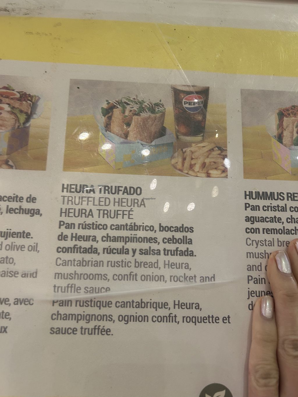 Diverse opzioni vegane, anche con filetti Heura e Nuggets. Ho preso un panino con hummus , davvero buonissimo. Il menù con patatine e bibite, costa circa 11€.