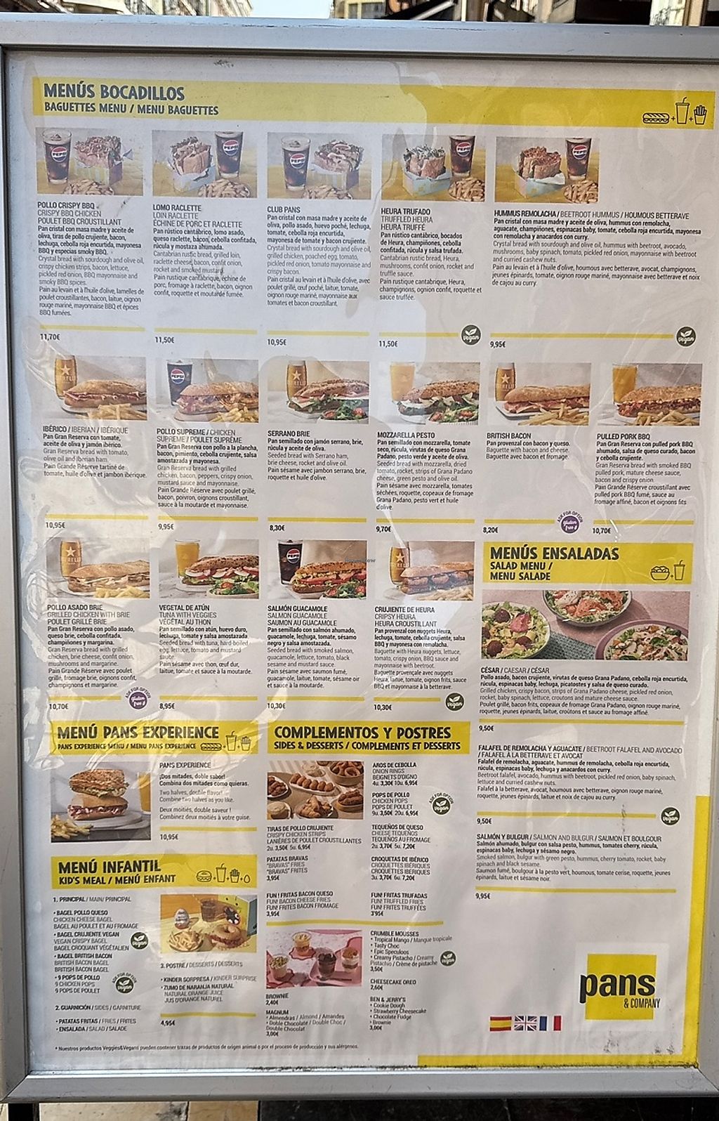 Options listed in English, Spanish and French and many sandwiches can be made vegan on request. The new Heura range looks great, I had the Heura queso bocadillo and the nugs and both were delicious. Tried my friends mozzarella pesto sandwich which was lovely too.