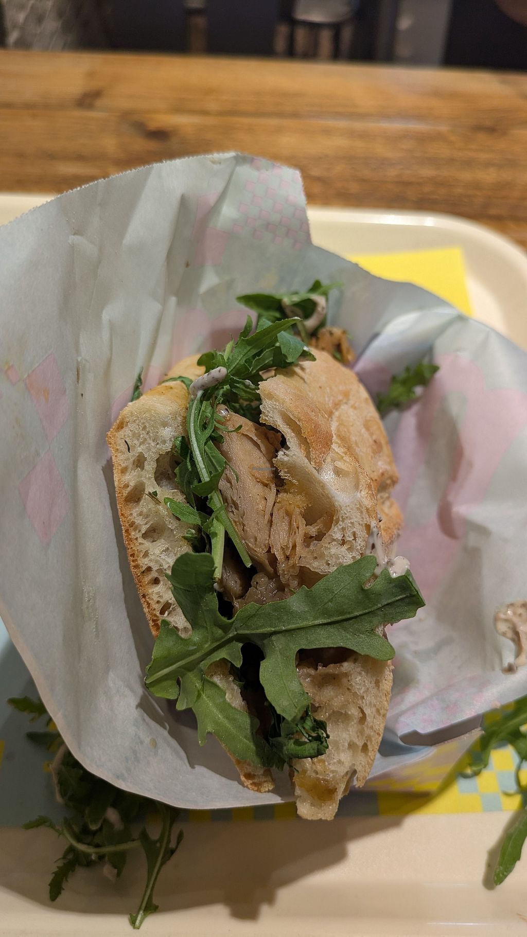 They have three vegan sandwiches- two with vegan 'meat' and one with humus. It was really tasty, good to eat something when you harry up