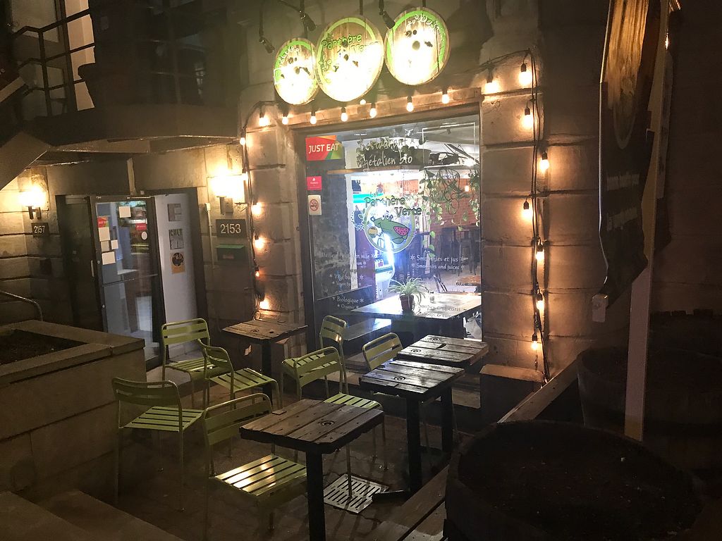 Tiny vegan restaurant with 3 tables outside on steps, more inside, but too hot in 29 degree Montreal weather! Fantastic Felafel bowl, so fresh, and absolutely delicious. Soy milk available for coffee. Environmentally friendly. Great staff.