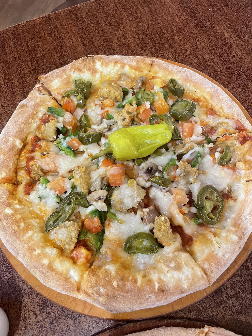 A rich menu, the pizza was really tasty, great cheese, an indulgent amount of toppings. Only the pieces of the non-chicken were too low