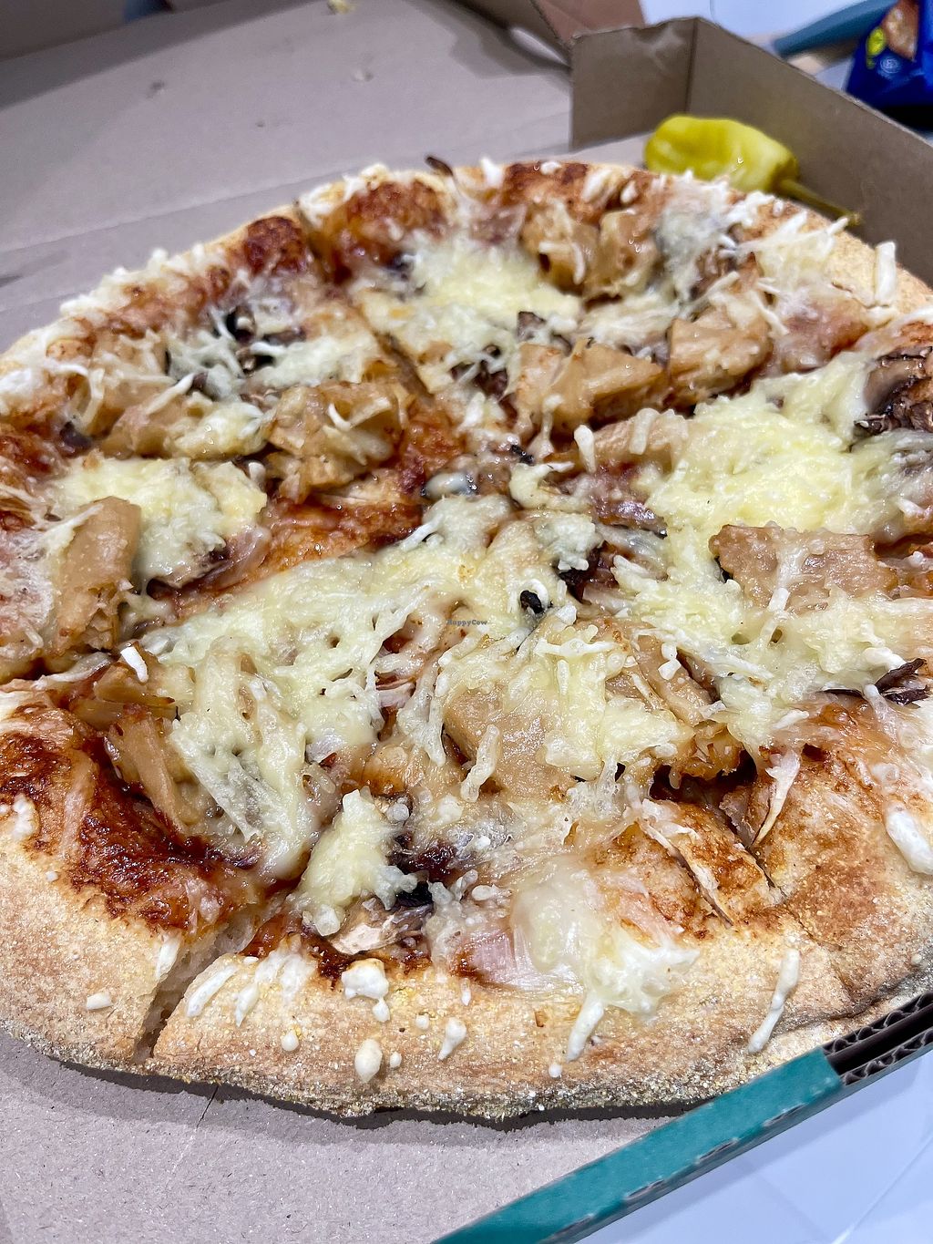 I got delivered Green BBQ vegan pizza with bbq sauce, plant based "mea…
