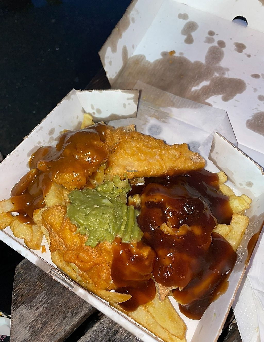 Battered tofu and chips with mushy peas, gravy and curry sauce (all vegan and gluten free), pretty good and nice to have a seaside tea 🌊😊 long queues and waited a while for takeaway as they go and make the tofu dish fresh. Be prepared it is just batter and tofu - I enjoyed it but if tofu isn’t your thing then you’ll think it’s plain