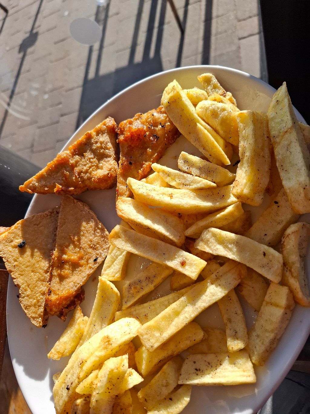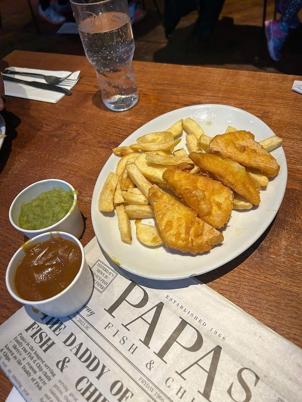Delicious Tofish and chips with mushy peas. Daughter had chips & curry sauce. Washed down with a pint of Guinness. Great service and a reasonable price.