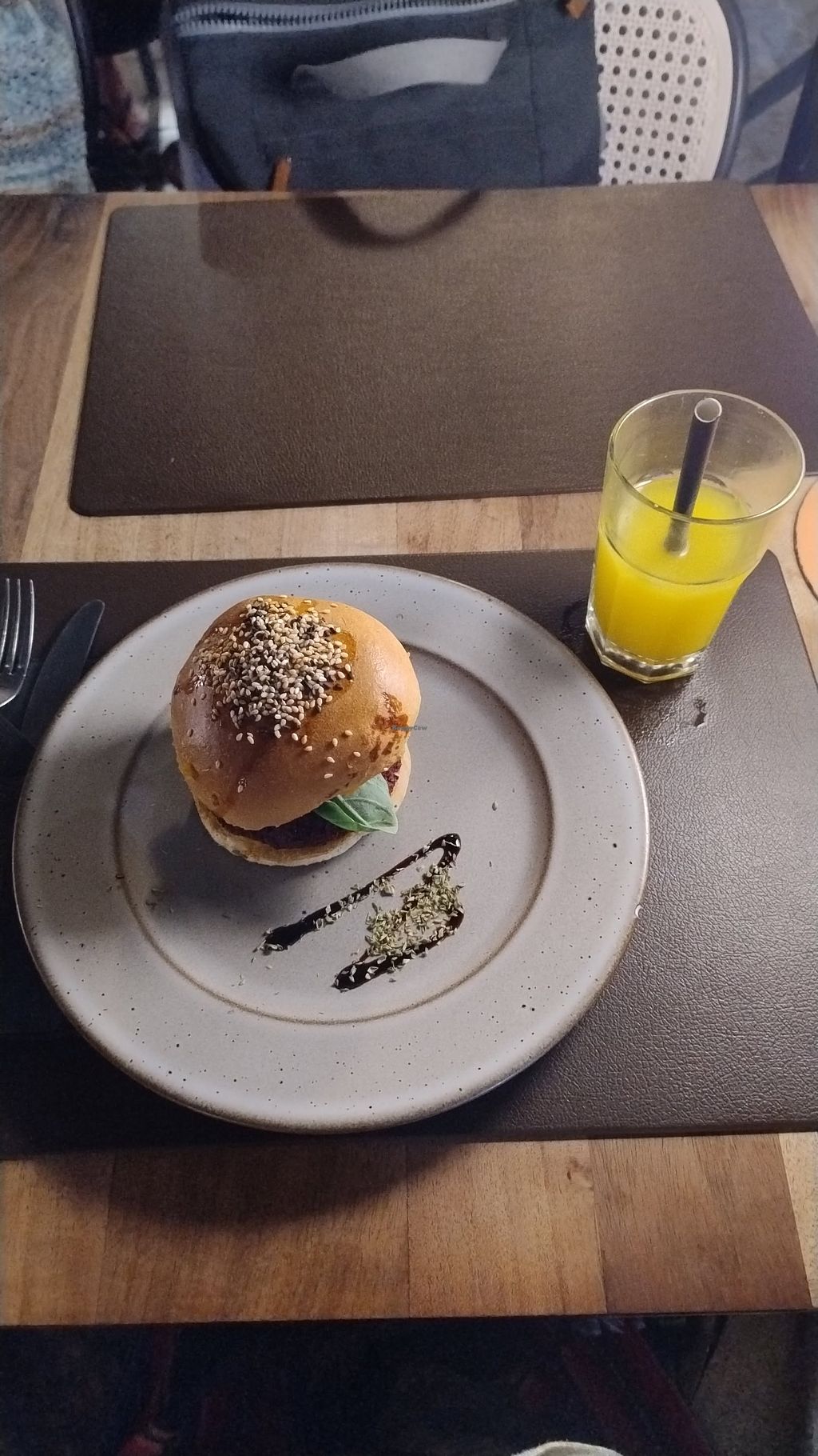 First time ordered a burger, which was good, and some freshly pressed orange juice. The place was packed and the service slow.