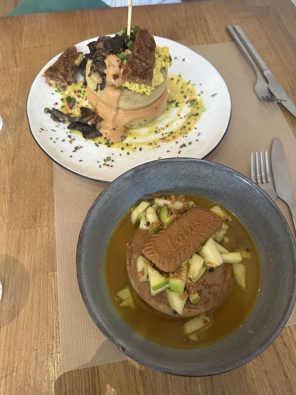 Très très bon même si les quantités sont à peines limite pour un grand mangeur 😂 les desserts comme les plats sont excellents. Toujours un peu dommage de voir juste un oeuf à la carte, alors que le restaurant pourrait facilement devenir 100% vegan 🌱🌻