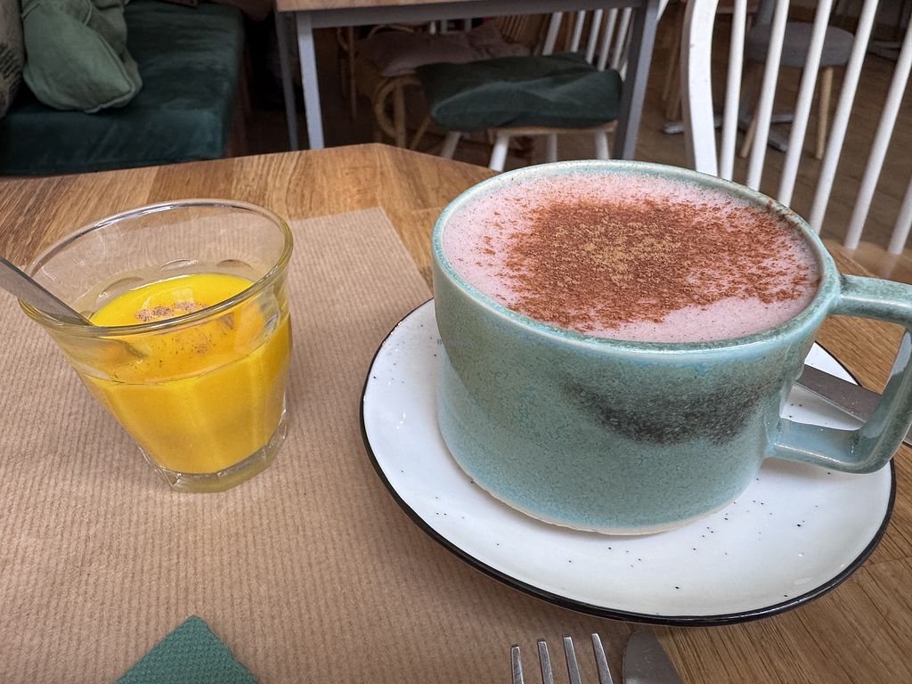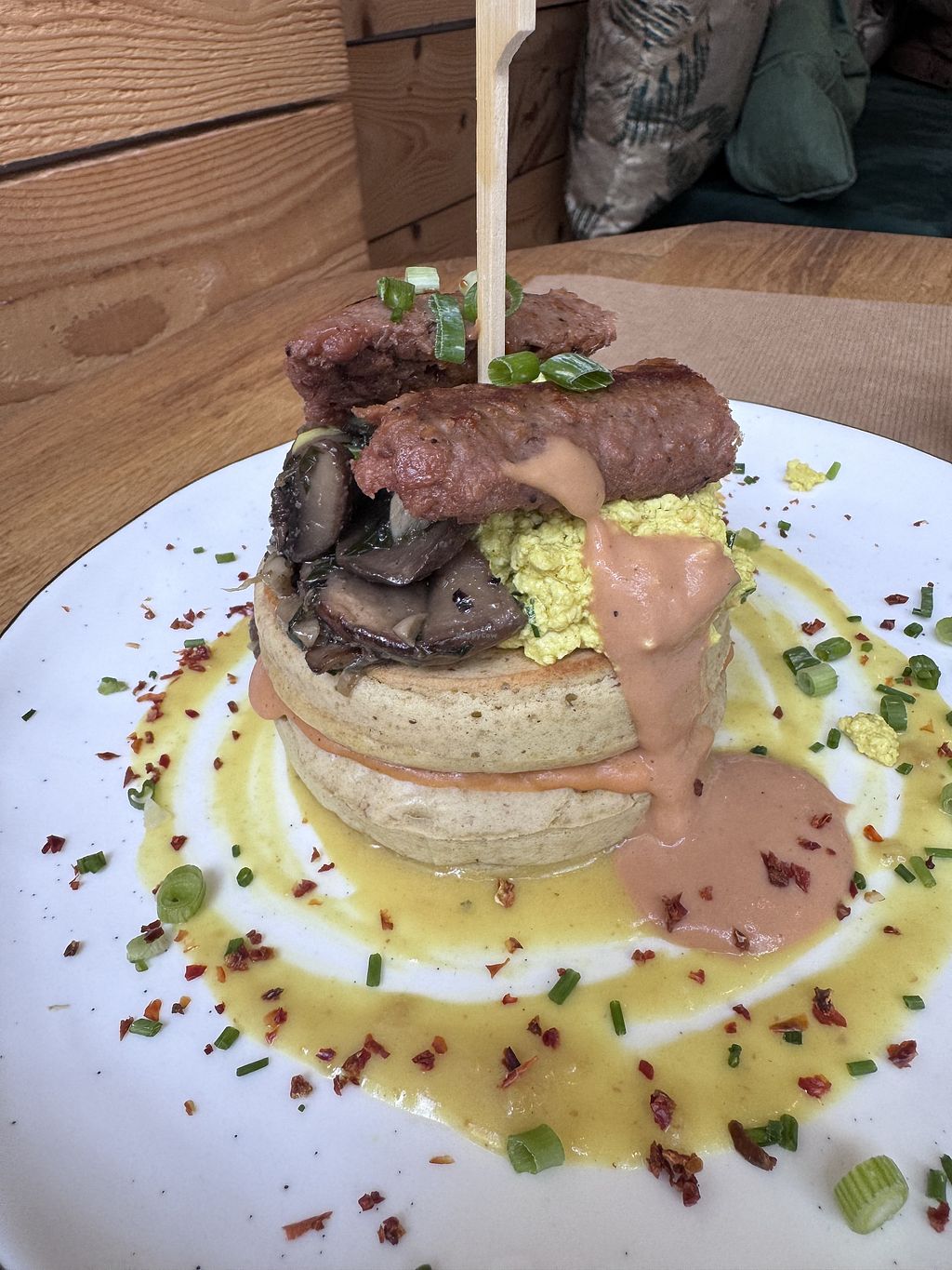 I had breakfast, which was pancakes, scrambled tofu, sausage and hollandaise, a turmeric shot and a really gorgeous Pink Chai Latte.