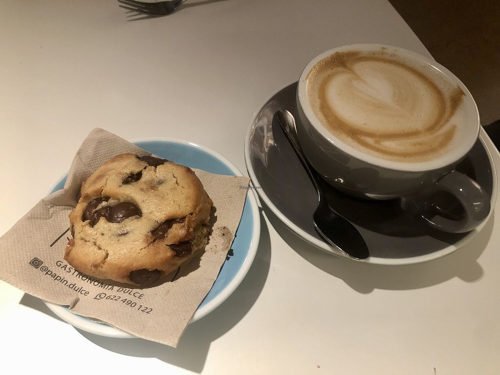 Rico café con bebida de avena, probamos también dos bizcochos veganos (uno de zanahoria y otro de plátano y nueces que fue el mejor) y un pastelito de arándanos vegano también. Local agradable y personal atento.