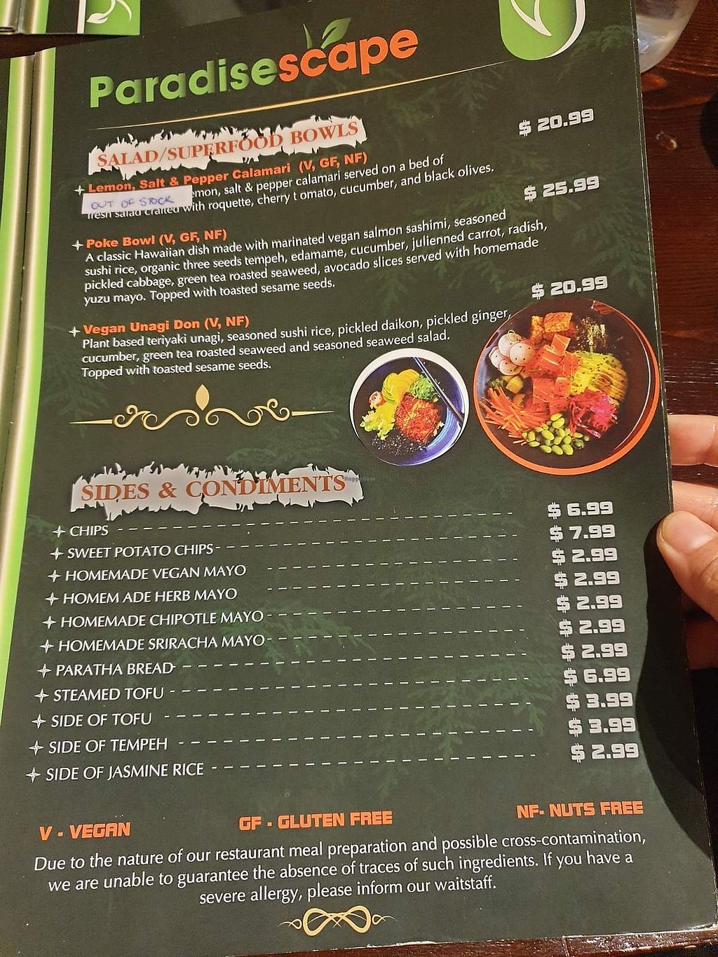 Read morePrevious review: I've ordered take-away from Paradisescape several times. I've had the Venezuelan pancakes, fish tacos and baked gnocchi. The only negative is the choc chip cookies (which the menu describes as "mind-blowing") were just store bought Leda choc chip cookies. They definitely need better cookies than that.