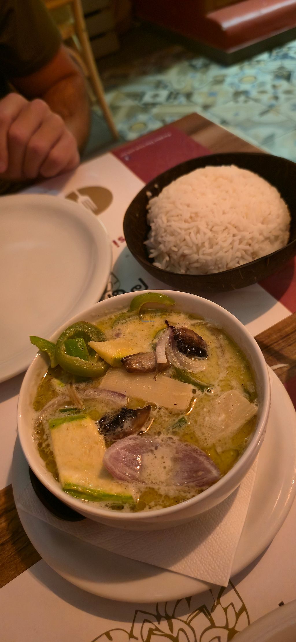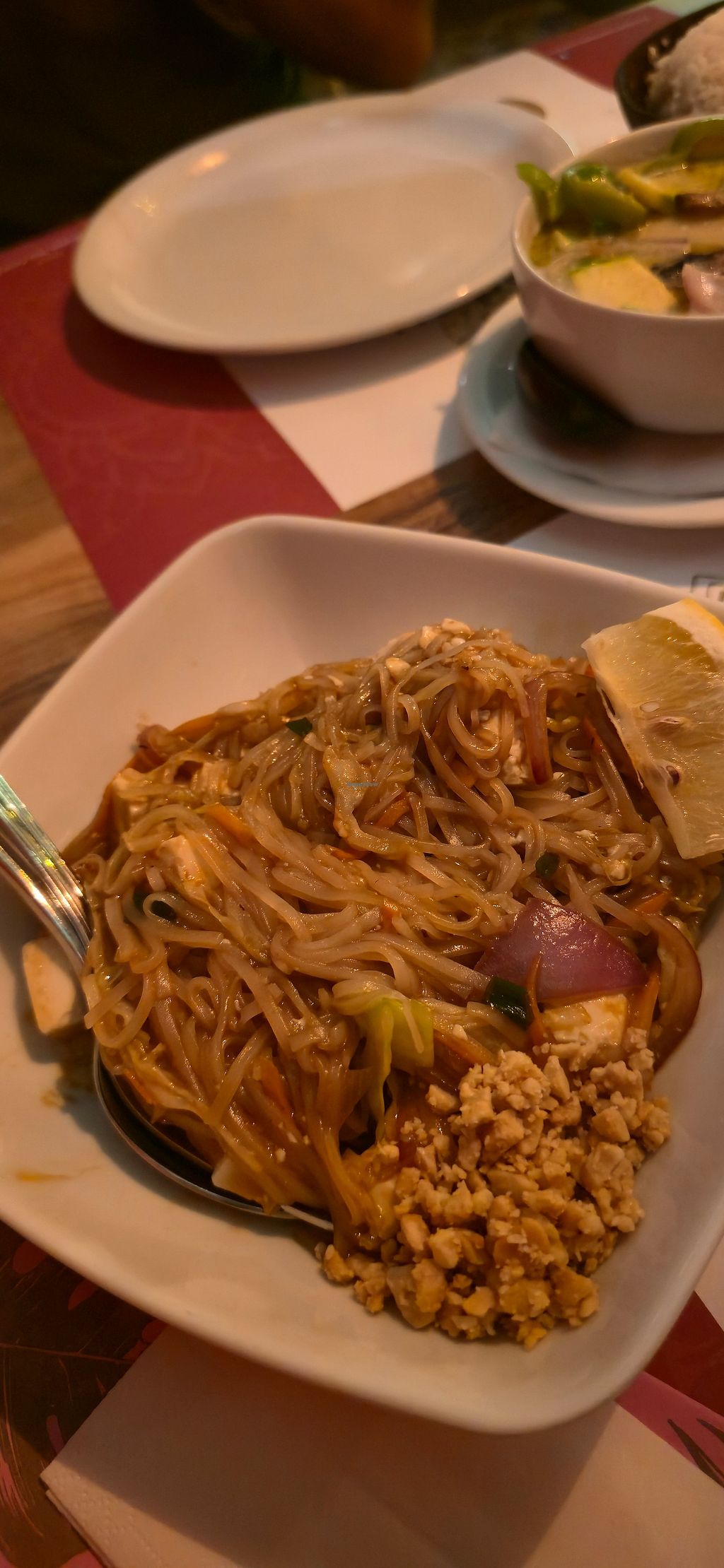 Had a fantastic vegan meal tonight -all for £32! Spring rolls for starters then we had vegetable pad Thai noddles and satay vegetables with steamed rice , this price also included two lagers. When we requested the bill , the waiter came with fried bananas for free. The food was excellent, the service very good and the venue excellent. The toilets were very clean too ,which I haven't seen much on this trip! Would highly recommend.