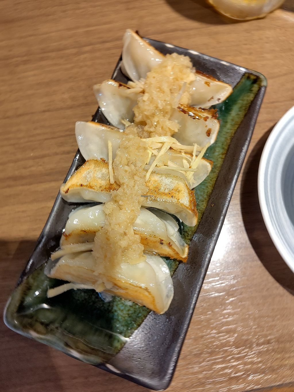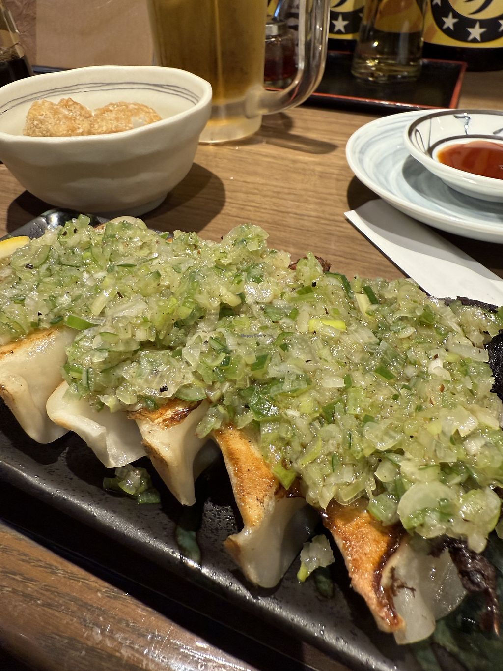 Fine vegan gyoza, and you can choose different tasty toppings like ginger and spring onions. They also have small dishes like friends soy meat, tofu, edamame and cucumber salads.