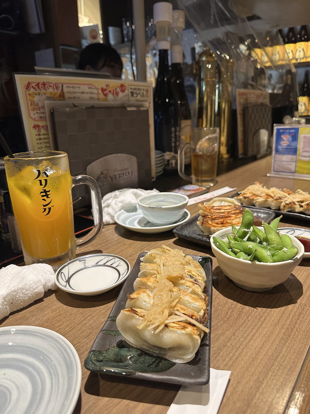The gyozas tasted nice but I couldn’t help see they came from an industrial frozen bag. Still it was a good option, be aware you need to order 1 drink per person and pay for cover seating (around 260 yen)