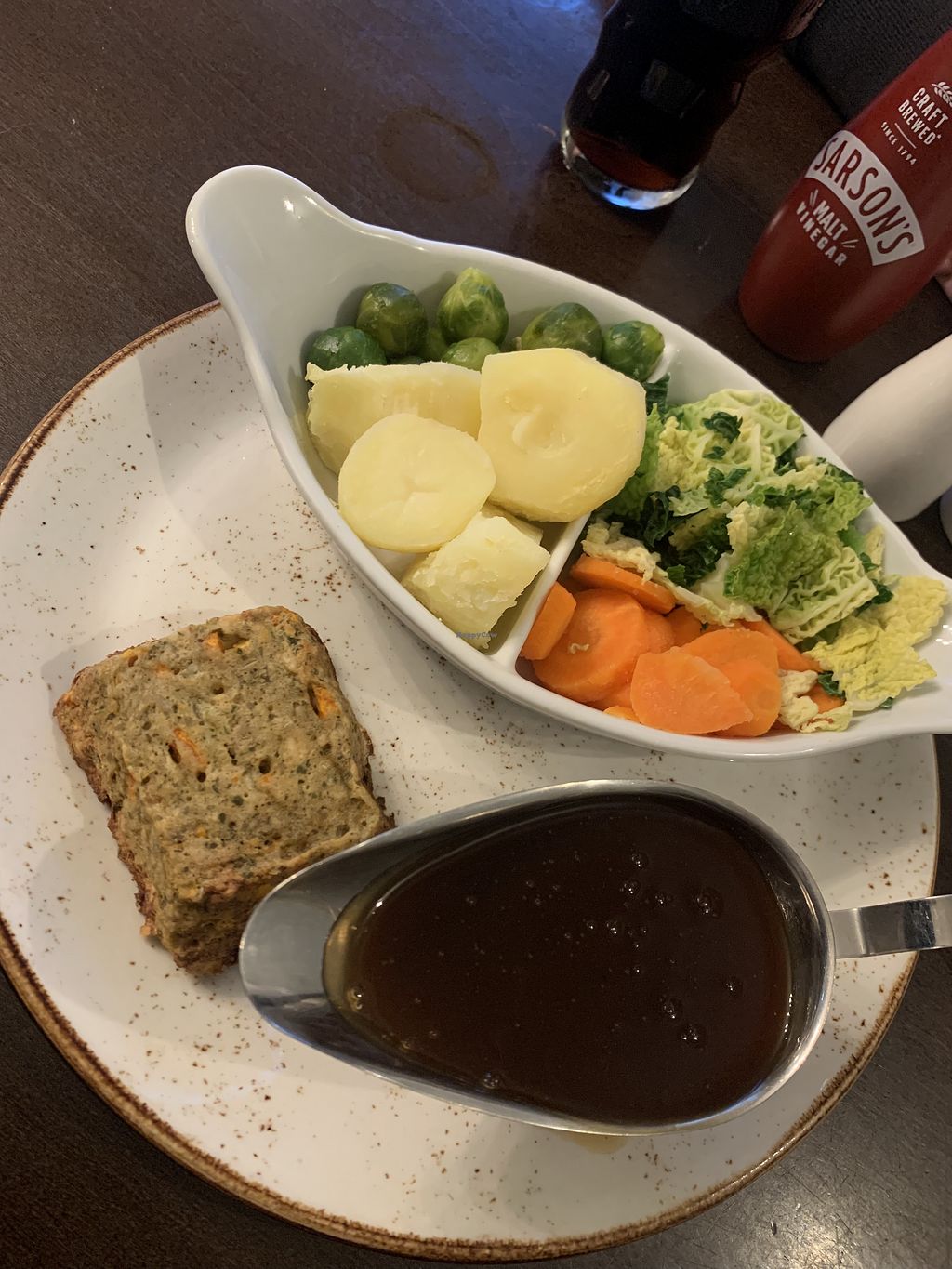 Came for a Christmas works event, and was happy that they offered some vegan starters and a main. The starters available were the mushrooms, melon, leek soup, and potato skins with a vegan mayo. I decided to try the melon, and for my main the nut roast. Once my main was ready it was brought out to the table, unlike a standard carvery where you would go and serve yourself. When I asked about my roast they made it clear that they prepared everything separate, thus the reasoning for it being brought out on its own.