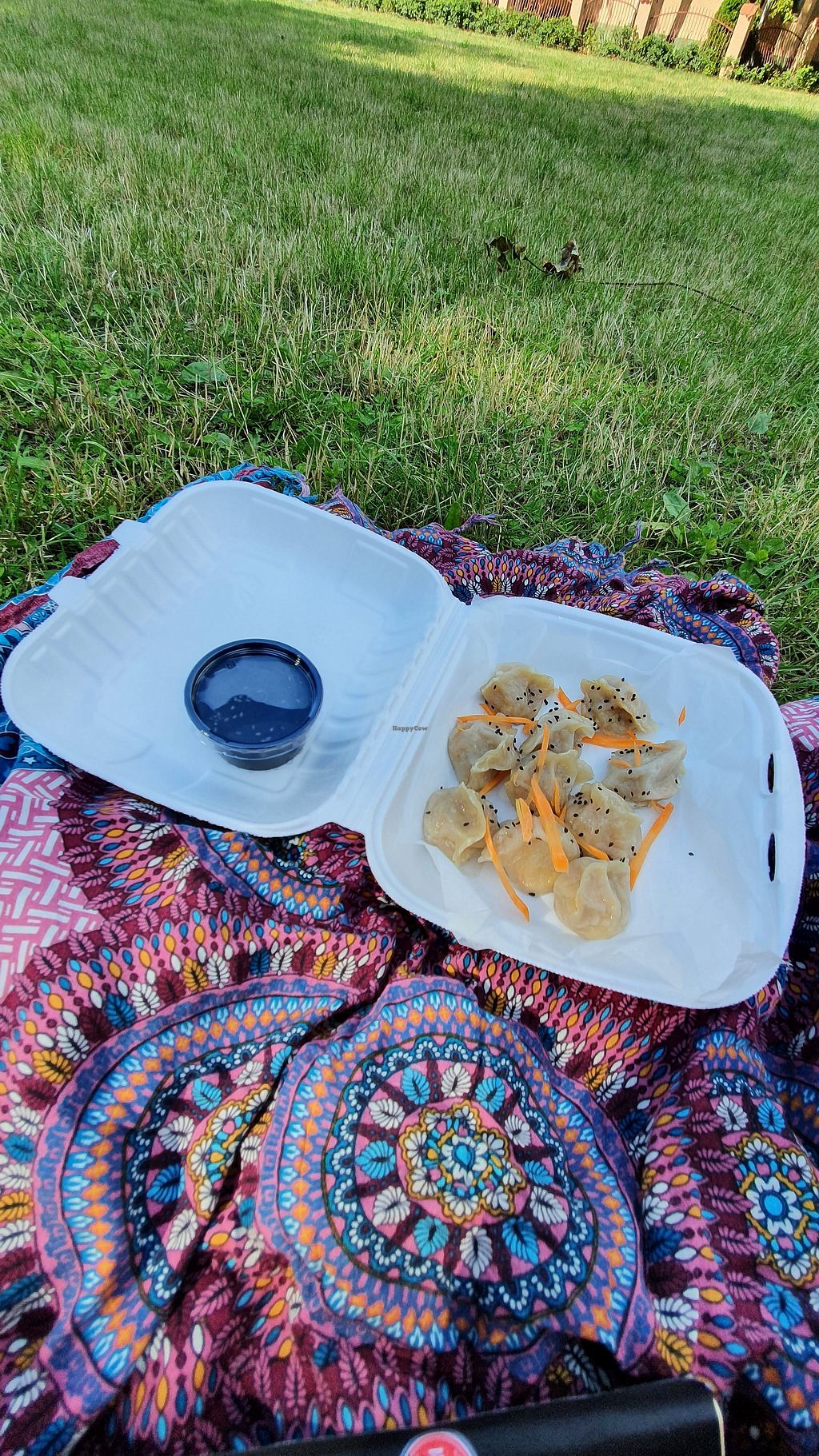 Ten dumplings with tofu and veggies enjoyed in a nearby park.