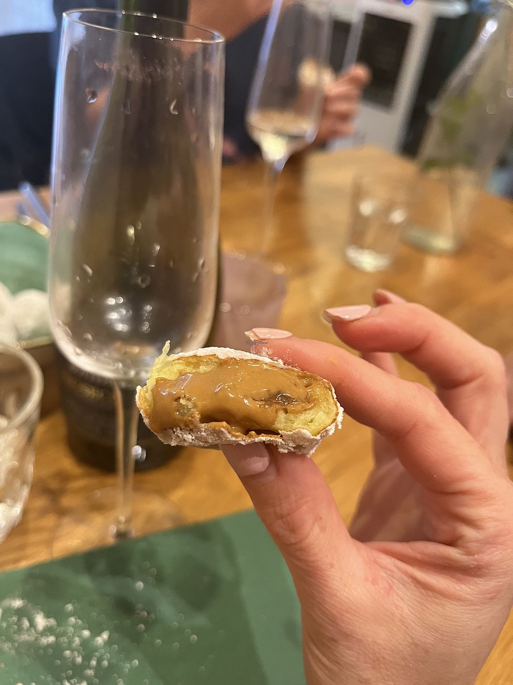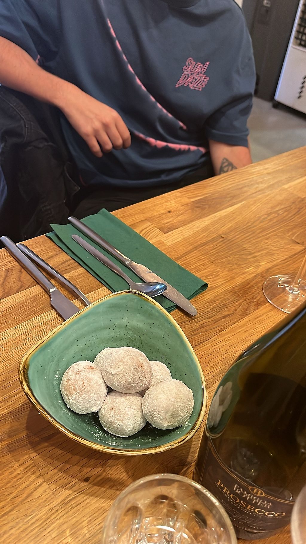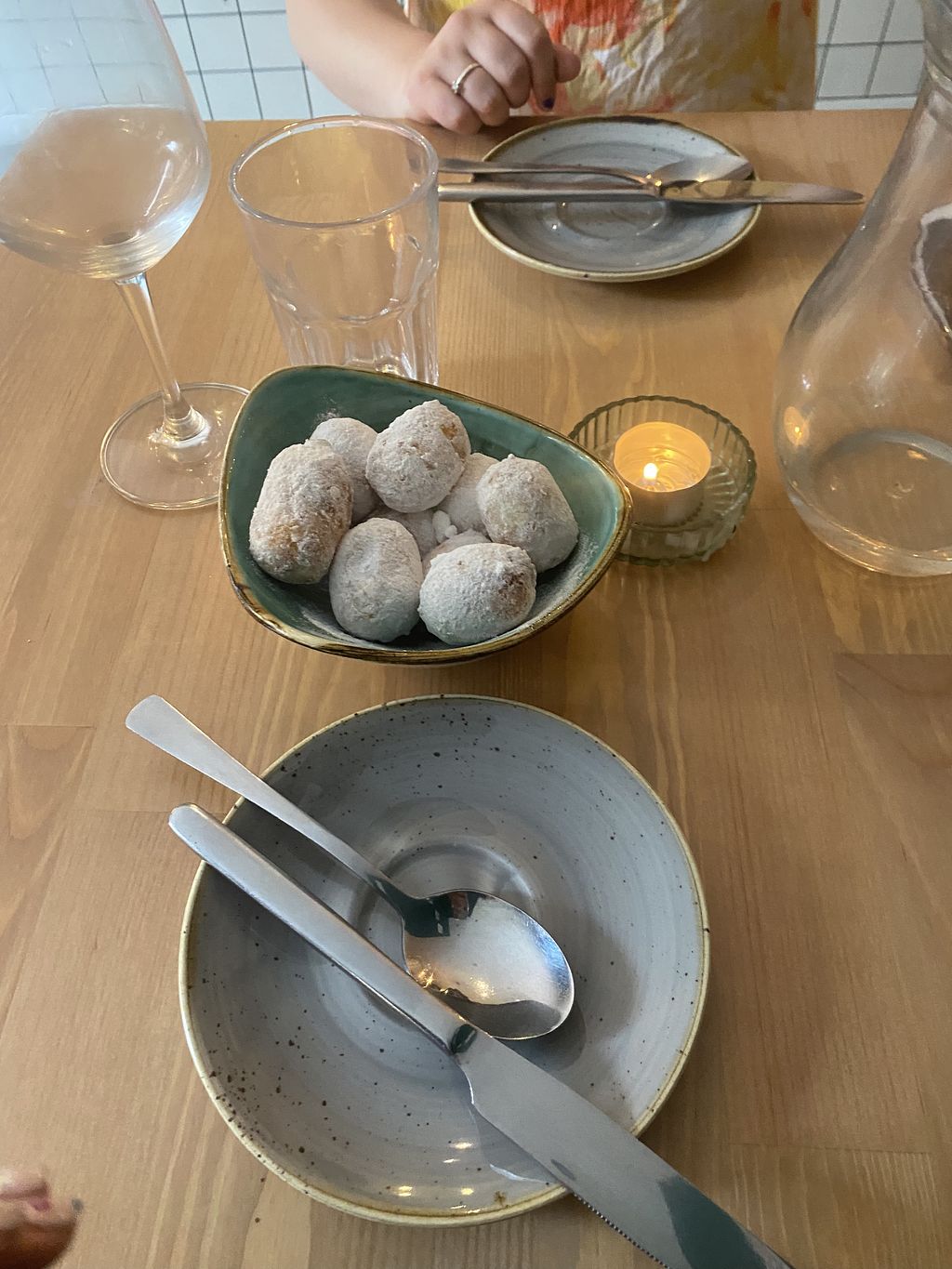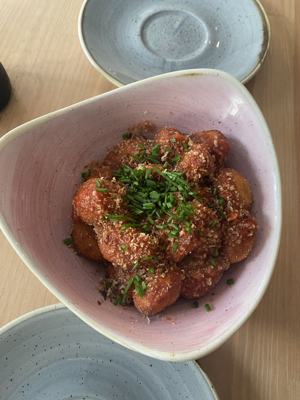 Deep fried Gnocci (bottom) Sourdough w/ tomatoes and garlic (top)