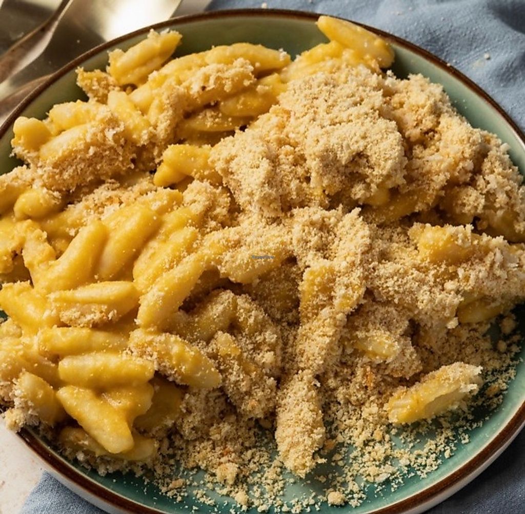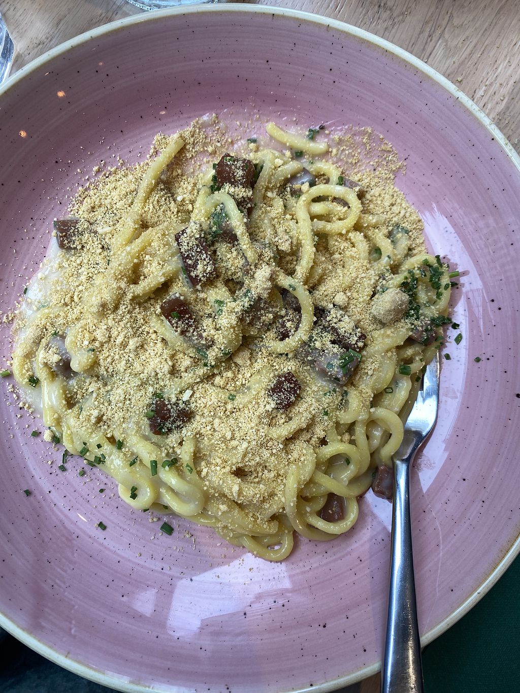Gnocchi with carbonara sauce, nuggets and bread and oil