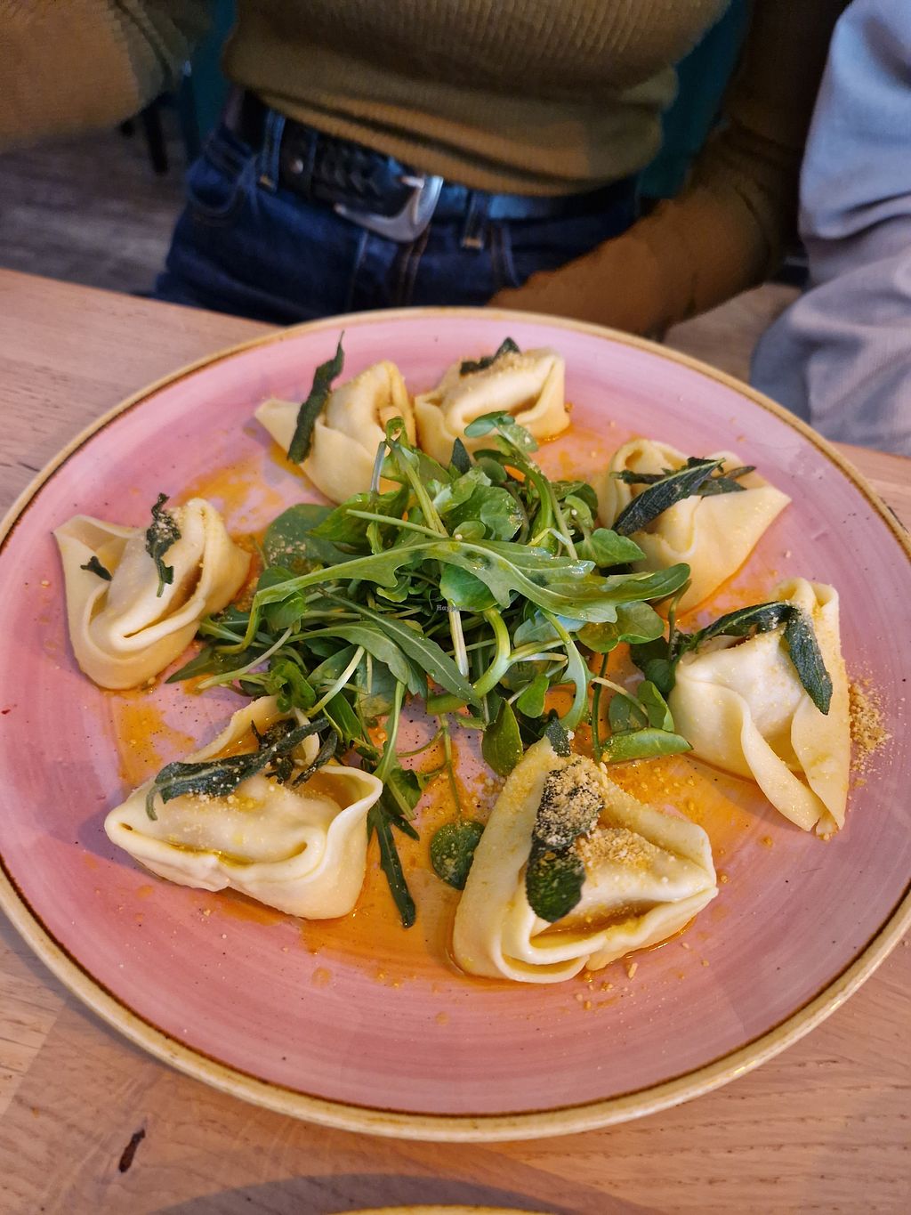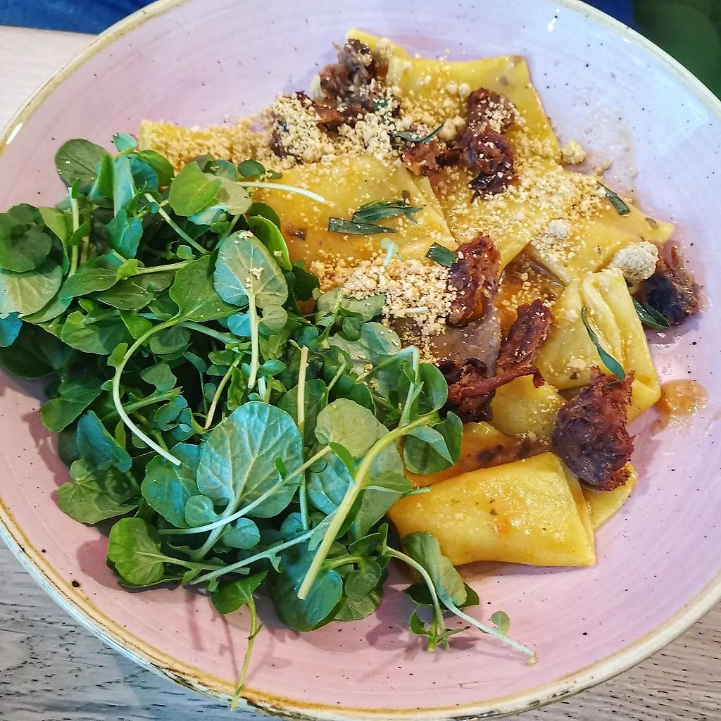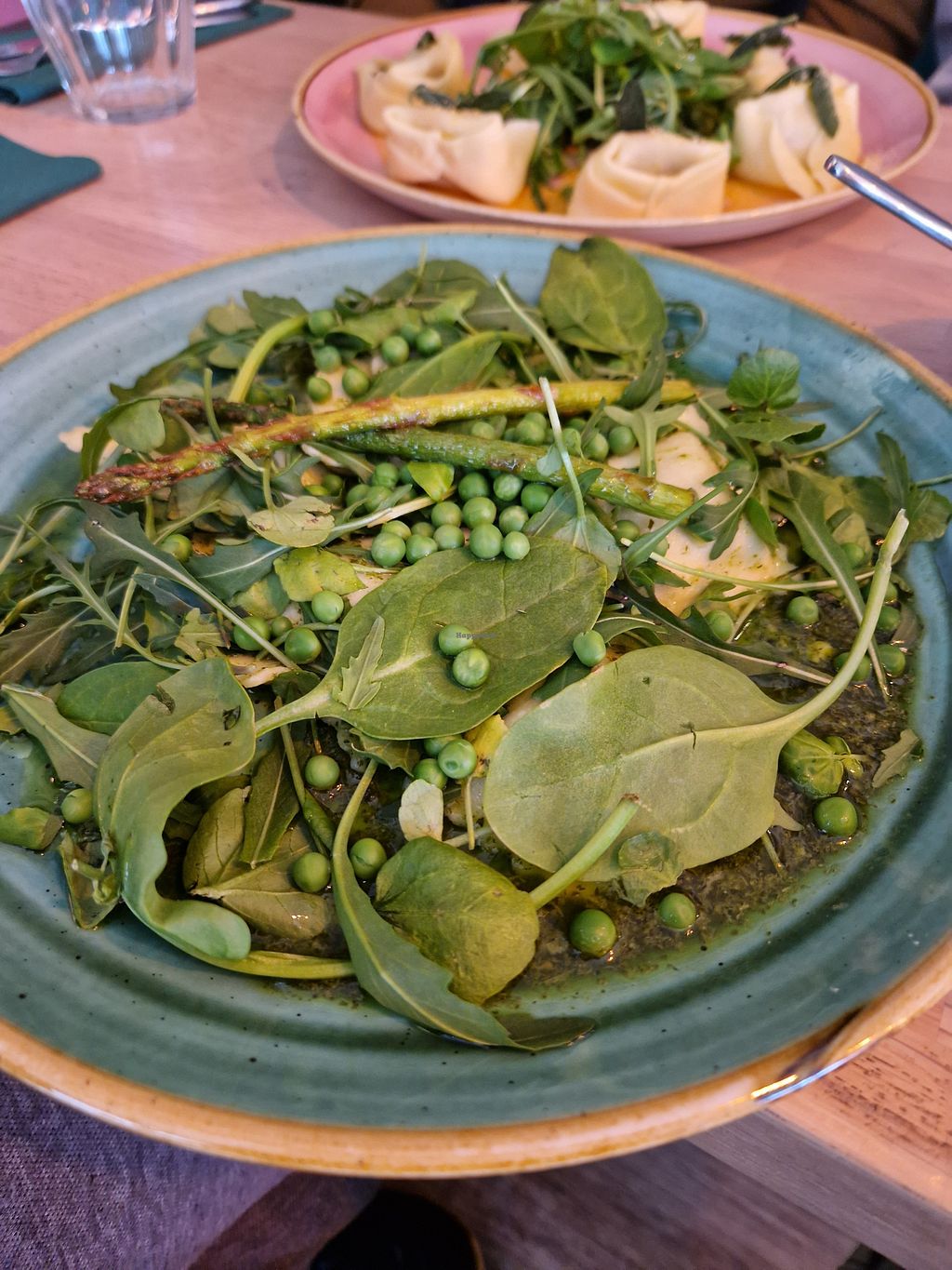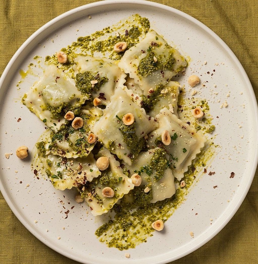 Green velvet pasta. Pea and shallot ravioli dressed with salsa verde a…