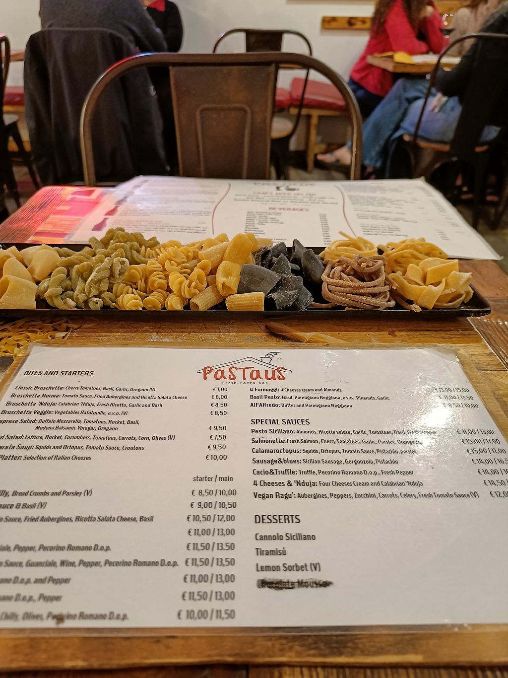 They have about four sauces for the pasta, I had vegan ragu (no ragu, just tomato sauce and vegetables) and it was delicious. You choose your pasta and two are vegan (ask which, it's the green spinach one and the brown spaghetti, on request they also have gluten free but I don't know if that's vegan). The pasta is excellent and cooked Al dente.