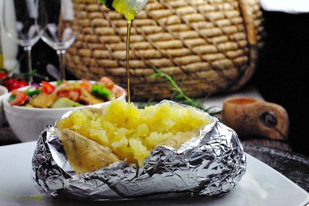 Una patata grande asada con toppings encima a tu gusto