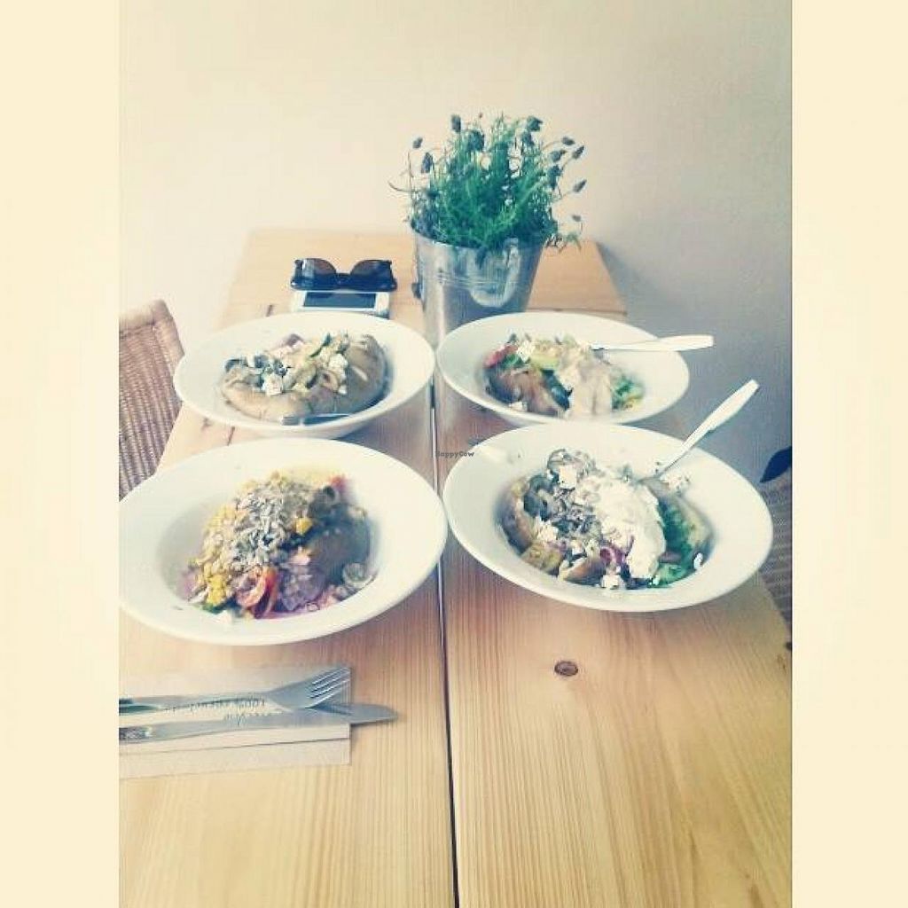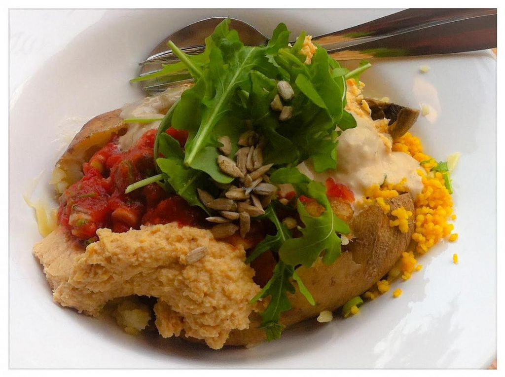 Kumpir with couscous, hummus, mushrooms, salsa, peanut sauce, rocket a…