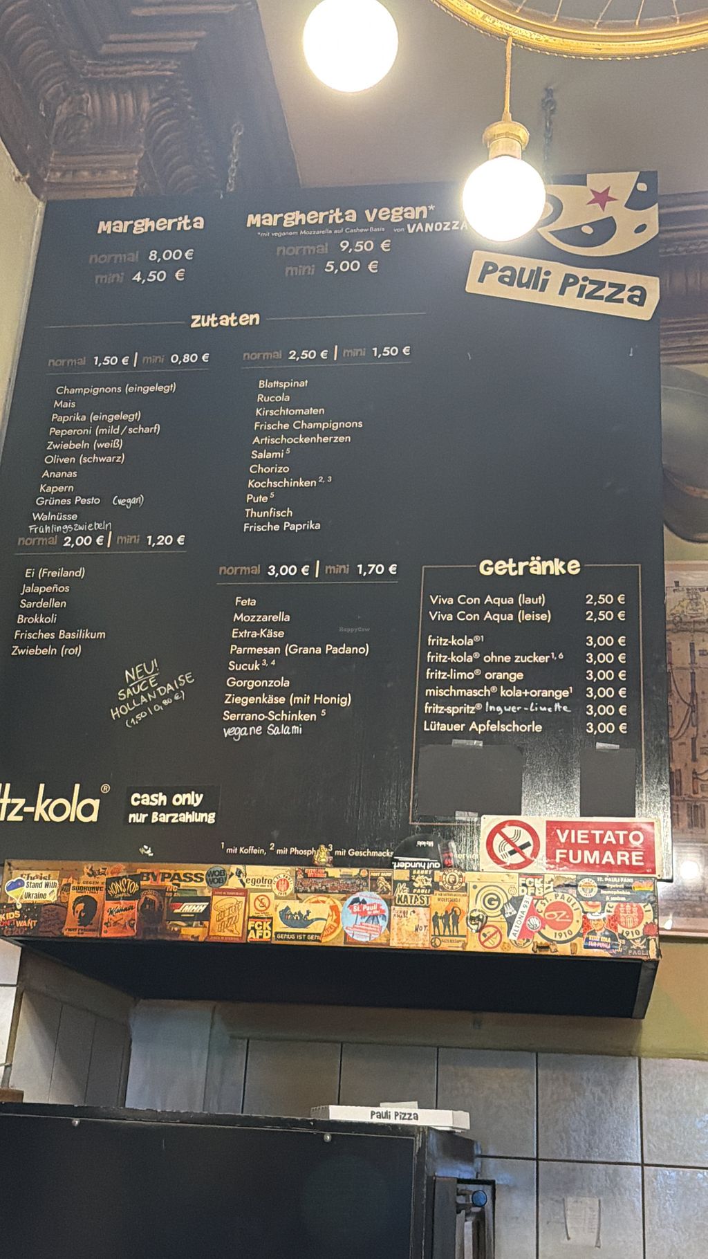 Serves meat, vegan options available. Pizzeria in St. Pauli, which offers a basic margherita pizza with vegan cheese and a variety of vegan toppings to add on. Open Mon-Thu 12:00-23:00, Fri-Sat 12:00-01:00, Sun 15:00-22:00.
