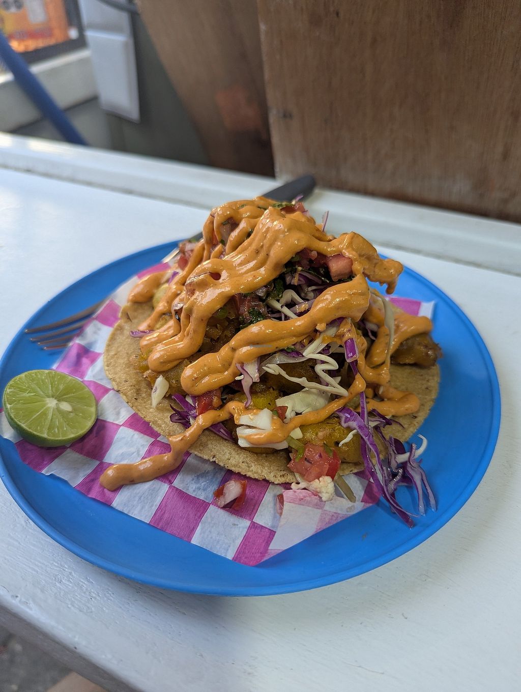 Very good Baja tacos made with mushrooms. They have pickles and an oily (but very tasty) peanut and seed hot sauce to add to your taco too. It was very busy when we arrived and the wait was a little long. They also didn't have the amaranth avocado taco available.