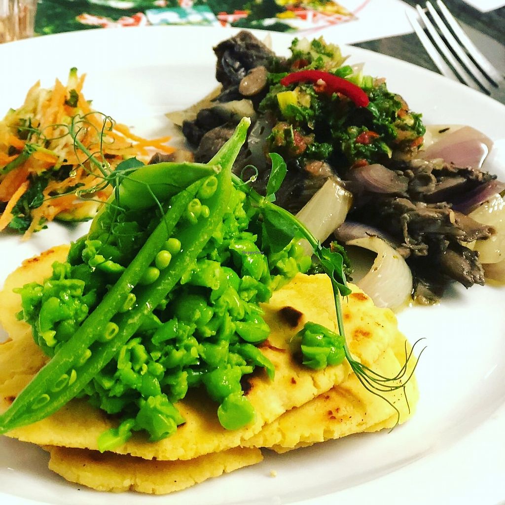Pea Flatbread with Pea Puree and Thyme Roasted Mushrooms