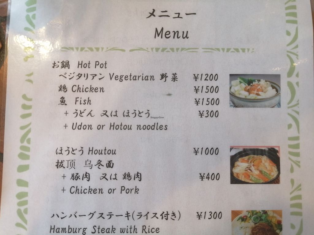 There was a BIG sign says VEGETARIAN !!! On the window so I was thrilled to go and was very hungry, on the first floor they were selling spiritual gem stones and again the signboard says PEACE, so I was completely expecting to have nice soy meat hamburgers or vegan sandwiches etc but NO !! All they had of vegetarian was just a “Steamed vegetables” for steeping ¥1200!!! And all other was beefs porks and chickens ...just left hungry!!!