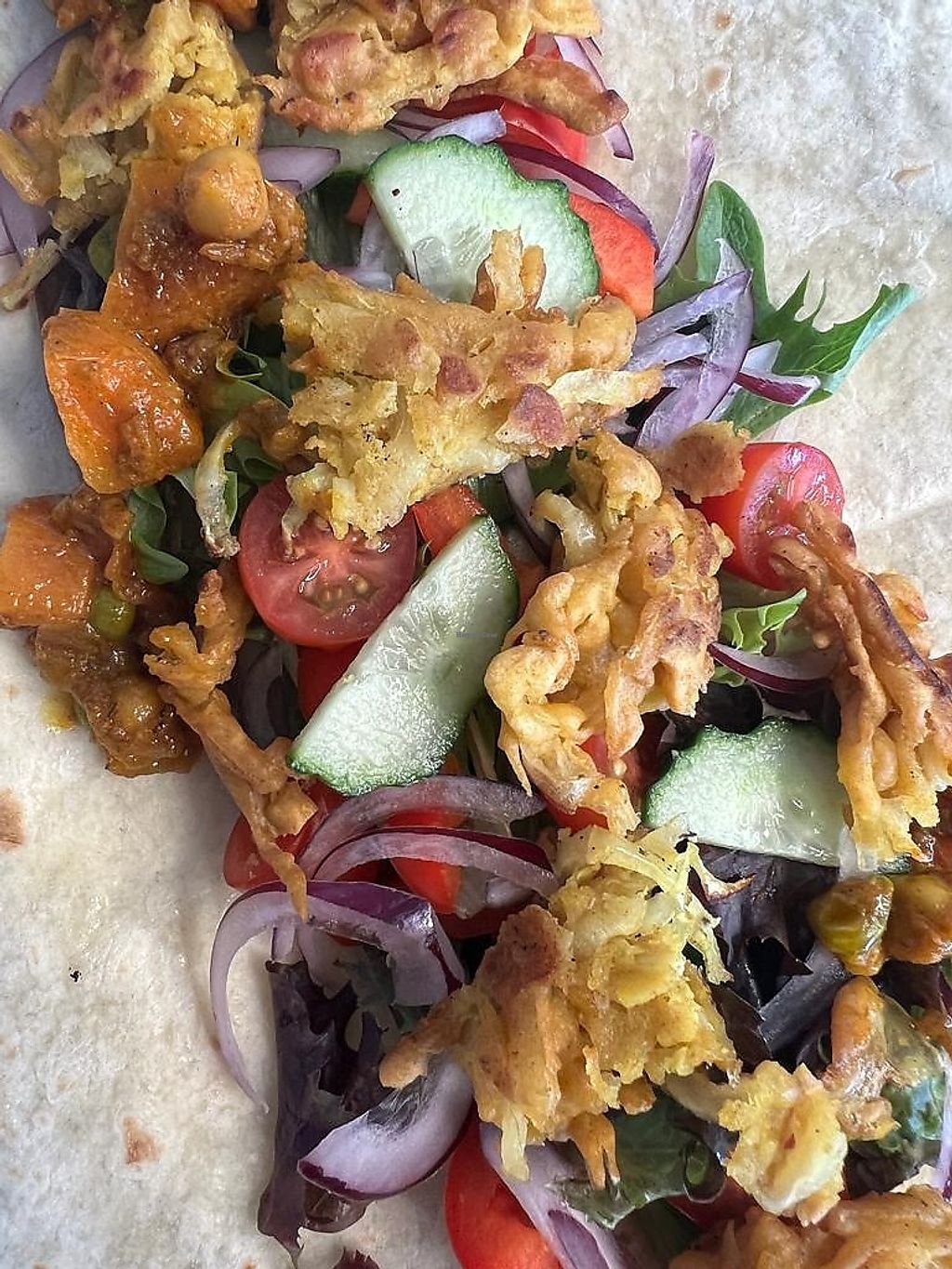 Home made onion bhaji and mango chutney wrap. My favourite.