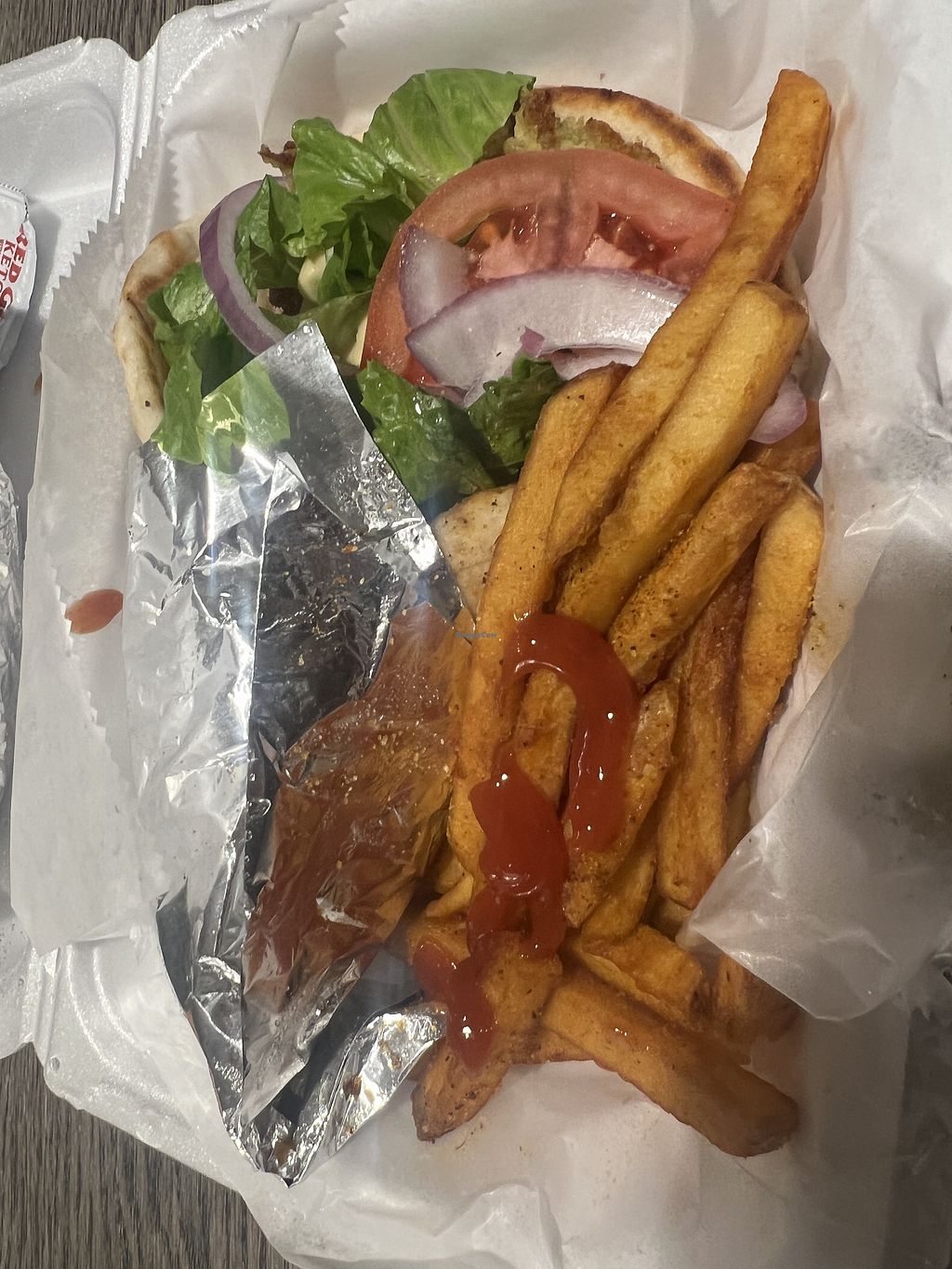 I enjoyed my hummus and falafel pita combo that came with fries and a drink. Friendly staff. She offered me hot tea while I waited for my takeout order. 😊