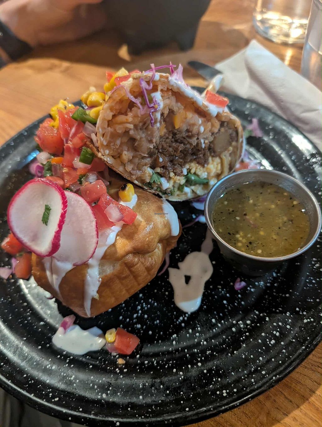 I had the chimichanga and the salad. I enjoyed them both, but the flavors weren’t as strong as I imagined they would be. The salad tasted good once you mixed in the dressing, but mine was missing the carrots and possibly the pepita seeds. The chimichanga contained a lot of rice, which made it taste a little bland overall. It did come with a semi-spicy salsa that could be used to jazz it up a little, though. Overall, it was okay, and I would give it another try.