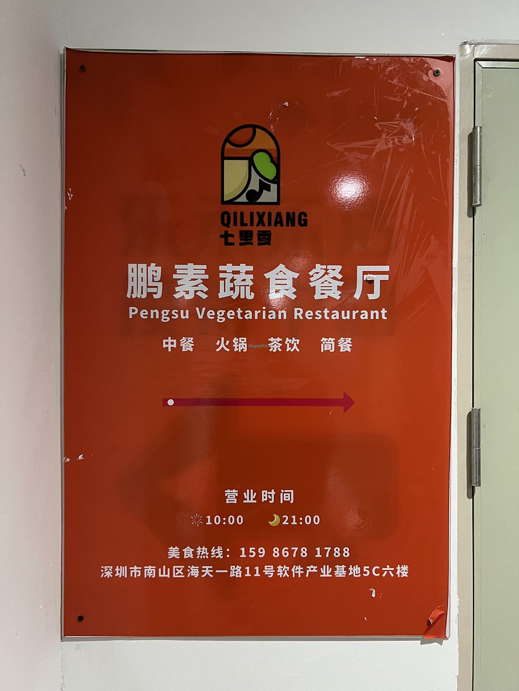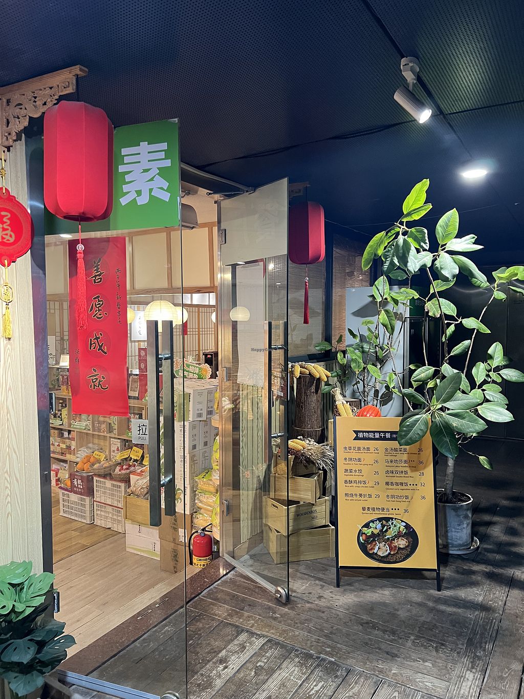 You can find the restaurant on AMap (Chinese name: 鹏素蔬食餐厅). It‘s a bit difficult to find: Go inside the building to the elevator C and go up to the 6th floor. Turn right and go around the corner, where you can find the restaurant at the end of the hallway. Order via QR Code, price is alright - we paid around 130 rmb for two people. It seems that all food is vegan, if unsure double check :).